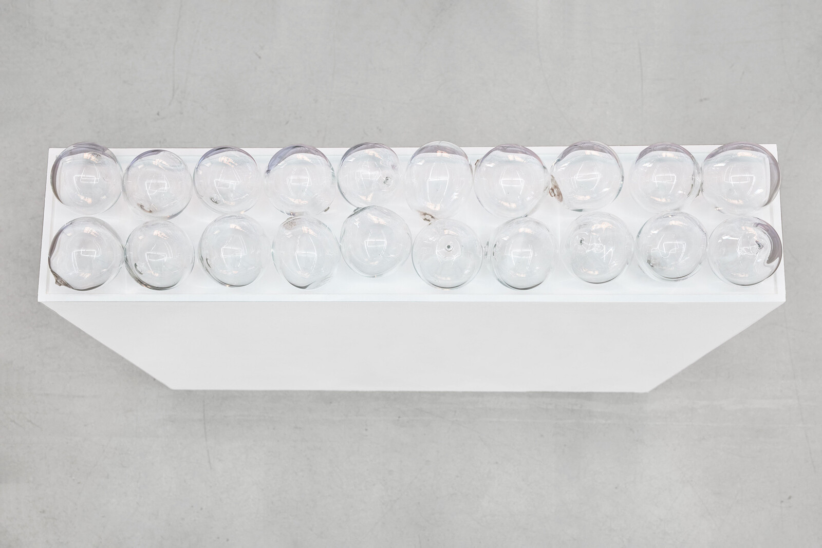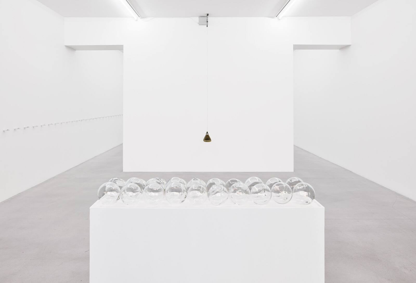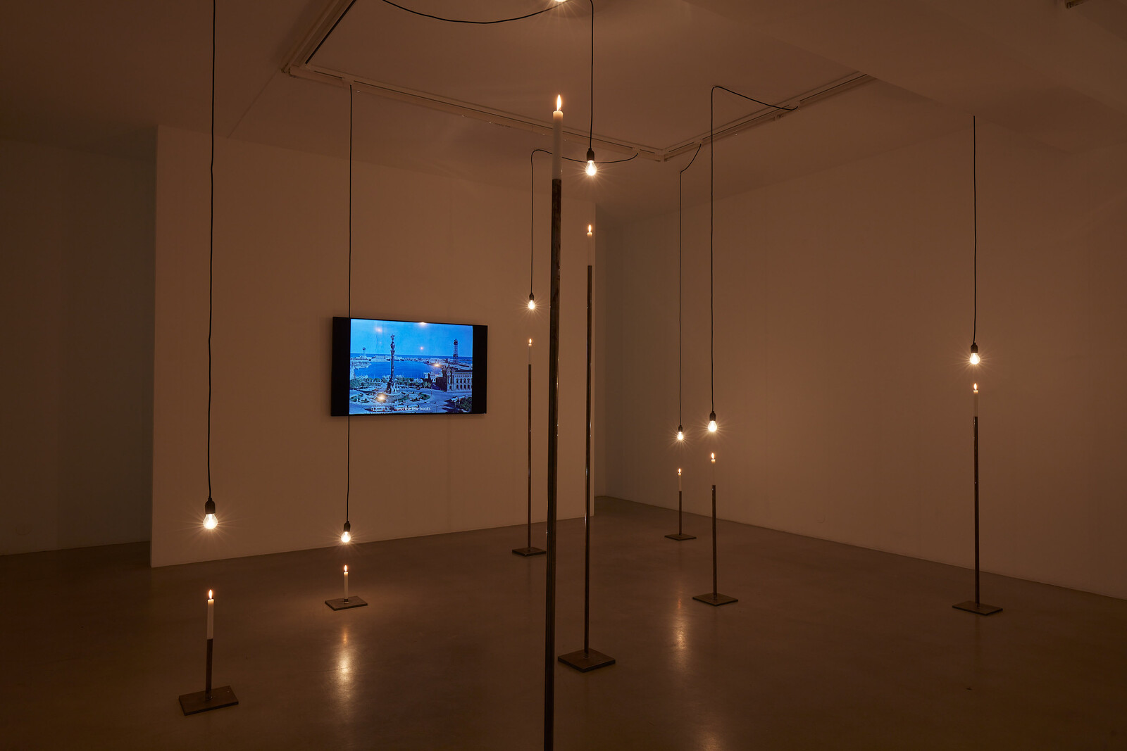 On one level I read “I am also smoke” as an ode to smoking because it is bookended in the space by works that directly involve cigarettes. The first sculpture one encounters upon entering—Air d’exil (we smoke for the dead, we store the dead, but they are not dead) (2019)—is a neat double row of Duchampian glass globes filled with smoke exhaled by Syrian asylum seekers. The last work in the show, Yo Tambien soy humo / I am also smoke (2020), is a video of the artist’s father relating the experience of his first cigarette on European soil after fleeing Argentina with his young family following the 1976 military coup.