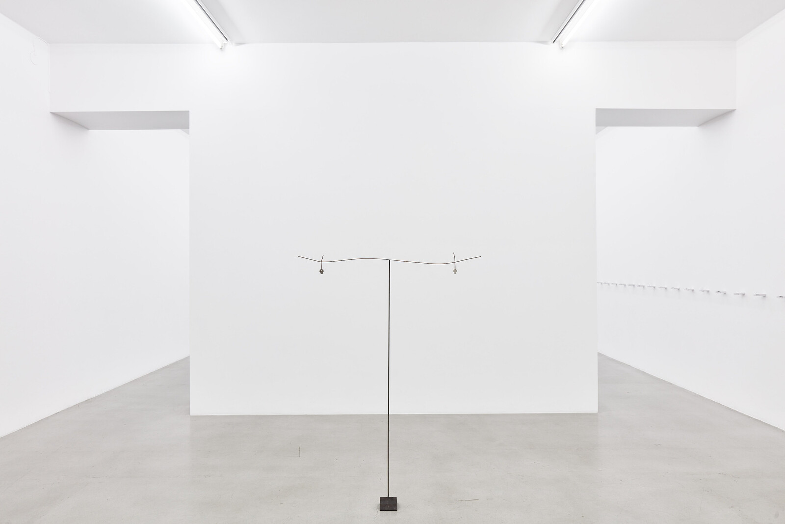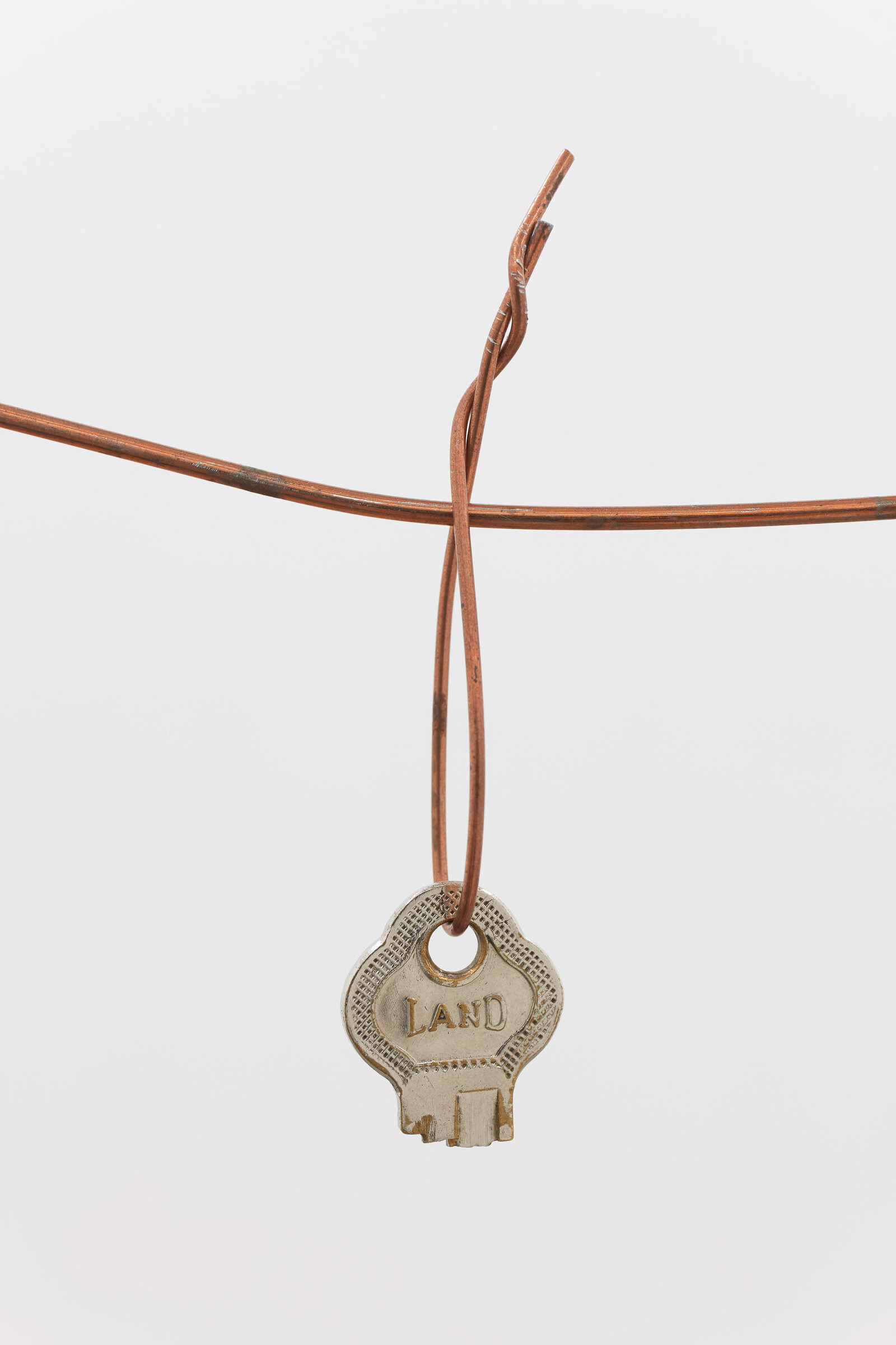 A sculpture in the middle room, entitled Language is a companion to empire (2020), footnotes this tension between submission and freedom. Two broken metal keys are suspended with copper wire from the arms of a simple iron cross. A word is emblazoned where the brand would appear on the head of each key. One reads “Land” and the other “Gold.” The words are engraved at the place where a finger and thumb would rest as the key is inserted into a lock and turned. This is language meant to be absorbed into the body rather than read. Amputated as they are, neither key will ever unlock anything again. No finger will ever rub the words inscribed in them unconsciously, one hand in a jacket pocket on a journey home. They constitute the broken promise of ownership and exclusive access. Crucified, they stand as a warning of the violence that stems from such fantasies of freedom.