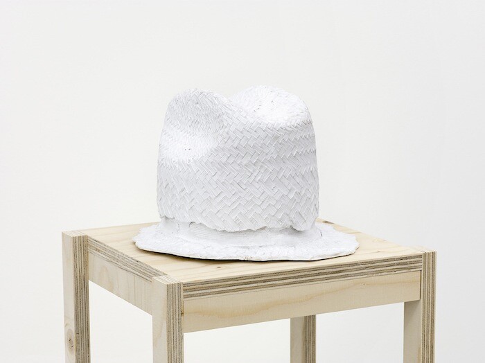 It seems fitting, therefore, that Swedish-Argentinian artist Runo Lagomarsino’s “We Have Been Called Many Names” highlights the invisibility of undocumented migrant workers in the United States. The exhibition consists of an installation of 28 white plaster casts of hats placed on wooden plinths, which occupies most of the gallery’s main room. The hats from which these sculptures have been cast—some made of straw, others the caps worn as part of a uniform—belong to workers in Los Angeles. These cleaners, security guards, gardeners, and service laborers operate on the fringes of American society, with few rights and no voice even as they perform the essential tasks that those from more secure backgrounds might turn their back on.