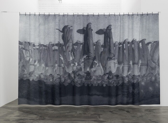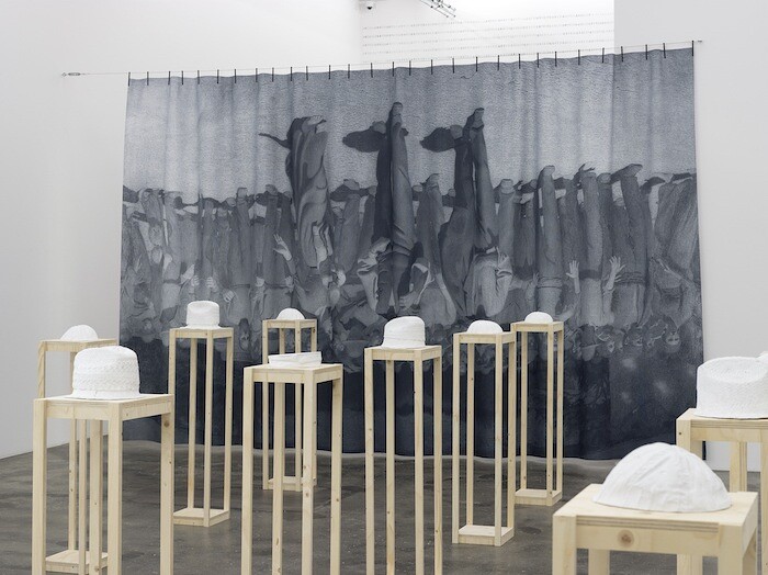 The array of wooden stools that serve as plinths form a square grid through which visitors can walk and inspect the diverse arrangement of hats, attaching to each a unique story with a shared ending. At the far end of the room Il Quarto Stato [The Fourth Estate ] (2017), a large black-and-white tapestry, hangs from the ceiling. The printed textile reproduces Giuseppe Pellizza da Volpedo’s famous 1901 painting of the same name, which depicts a group of striking workers, suggesting they constitute the Fourth Estate. Yet the image hangs upside down, a reference to América Invertida [Inverted America] (1943) by Joaquin Torres-García, for which the Uruguayan painter inverted a drawing of South America so that southern hemisphere occupied the top half of the frame, and Uruguay was at the center of the world. Despite these important references, the work is too direct to leave room for anything other than the intended reading, and feels didactic.