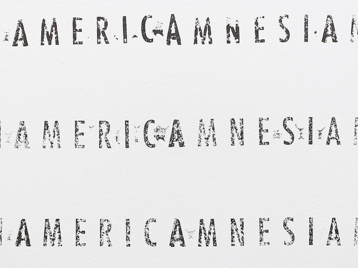 In a second room screened off from the first by the large tapestry, the far wall is covered with lines of text. The word “AMERICAMNESIA” has been hand-stamped directly onto the wall from top to bottom. Variations in the resolution of the lines—some darker, some lighter—make a dizzying spectacle. But the message Lagomarsino is trying to portray is clear, perhaps too clear. On the floor in front of the wall is a stone block in which the imprint of a small hammer is visible, Sorgearbete (2017). The outline is clear, but the tool itself is absent, once again signifying the invisibility of the worker. Where Gustave Courbet portrayed the worker with the hammer in hand (Stonebreakers, 1849), Lagomarsino shows only the hollow imprint of a tool. The two works share the same intention though: to portray the invisible laborers. The English translation of Lagomarsino’s work would be Sorrow Works, and again, the reading cannot be misunderstood.