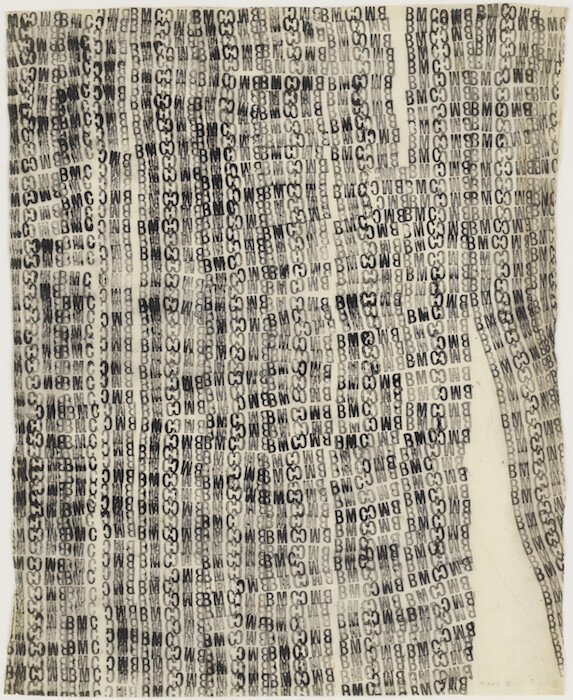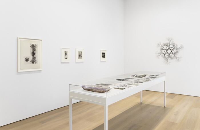The text next to the basket in the vitrine says that Asawa gave it to Josef and Anni Albers circa 1948–1949, and in interviews Asawa talked about Black Mountain College being a refuge from the racism that for artists like her and Jacob Lawrence existed literally just outside the school’s front door in rural North Carolina and the rest of the United States. At David Zwirner, the first piece greeting visitors is a work on paper that features the letters “BMC” (i.e., Black Mountain College) stamped in vertical rows. Asawa has also mentioned the importance of Josef Albers’s famously rigorous teaching, especially his focus on fundamentals such as the line, and it is possible to see her sculptures as drawings in space, made, as they frequently were, from a single strand of wire. One also imagines that Anni Albers’s important—and still somewhat overlooked—work in textiles must have been influential on Asawa’s sculptures as weavings.