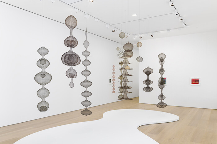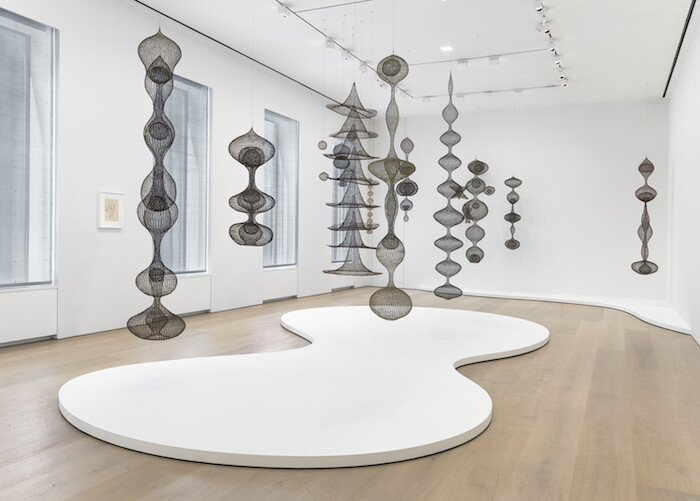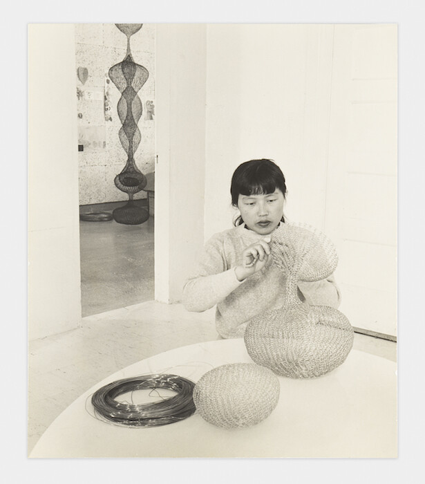 One of the three gallery spaces at David Zwirner’s Ruth Asawa exhibition contains a display case featuring archival photographs taken by Imogen Cunningham of the artist in her studio and with her family; an earlier photo of Asawa in class with Josef Albers at Black Mountain College; a letter Asawa wrote to her future husband, architect Albert Lanier, with enclosed drawing; and more. It also features a small color photograph of Asawa in Mexico placed near a flattish, oval basket made of thin, metal wire. This latter, relatively unassuming object, barely highlighted within the overall exhibition, is in fact a key to Asawa’s important art, which until recently has been neglected, despite a scattering of noted shows. Similar to the painter Etel Adnan, who like Asawa lived and exhibited locally in the San Francisco Bay Area for decades, Asawa did not achieve international renown until much later in life. And like Adnan, she was displaced by war.