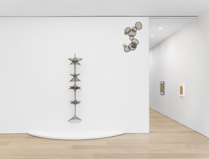 While a teenager, Asawa was one of the roughly 120,000 Japanese Americans forced by the United States government into internment camps during World War II. Asawa’s father, a farmer in California, was detained first and sent to a separate location; she didn’t see him for six years. Asawa spent nearly a year in camps in California and Arkansas before graduating from high school. Discriminated against at Milwaukee State Teachers College, she found her way to Black Mountain College in 1946. Already producing abstract patterned paintings and works on paper, a few of which are on display at David Zwirner, Asawa learned from weavers in Mexico how to make baskets using wire during a trip there in 1947. Most of the work at David Zwirner’s mini museum-quality exhibition is the result of this formative experience by an artist whose practice combined Mexican craft traditions, European high modernism, and her Japanese American cultural background.