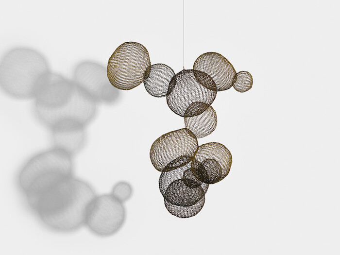 Also featured at David Zwirner are works fashioned into tree branches sprouting into geometric patterns. These pieces perhaps most exemplify Asawa’s wrestling with the container and containment, and with a fusion of the organic and inanimate. They combine the two basic shapes—sphere and triangle—she manipulated in various mediums throughout her life. Installed on the wall and made of wire, but this time collaged and stitched together, the branches radiate from a center that is similarly displaced in the vertically hanging works. The latter, nestled yet floating, are sometimes installed in clusters, particularly the smaller ones, although they usually hang alone. Both the light that filters through them and the shadows they cast are crucial parts of the work, an aspect captured in a few of Cunningham’s photographs and in one of the galleries at David Zwirner featuring natural light. Sewing together disparate elements, Asawa’s sculptural works are fluid within the spaces they uniquely command as if between worlds.