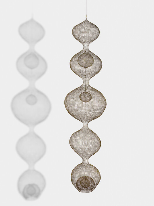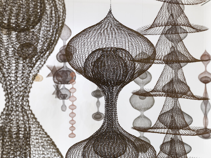 Asawa wove vertically hanging sculptures ranging from ten feet to a few inches made of brass, copper, and iron wire—sometimes oxidized, enameled, or gold-filled—in biomorphic spherical and triangular shapes. (All works are untitled; the entire exhibition ranges from 1946 to 1990.) A few are circular in form, especially the smaller versions, but most are sinewy, sometimes elongated, like interconnected hourglasses or lobes; the triangular ones resemble open cones, and are sometimes stacked, sometimes inverted. Works not made with brass wire tend to be black; only the gold-filled ones might be considered shiny. Asawa delicately embeds forms within forms: a sphere resting with a sphere, an oval within an oval—nurtured yet confined. From a distance her sculptures look a bit like nests, but closer up the metallic materials also evoke a delicate cage. The forms are elastic and meant to reflect nature, yet when near to them, their inorganic materials make them feel slightly cold. One does not need to read these sculptures biographically to see the complexity of influences and experiences at play.