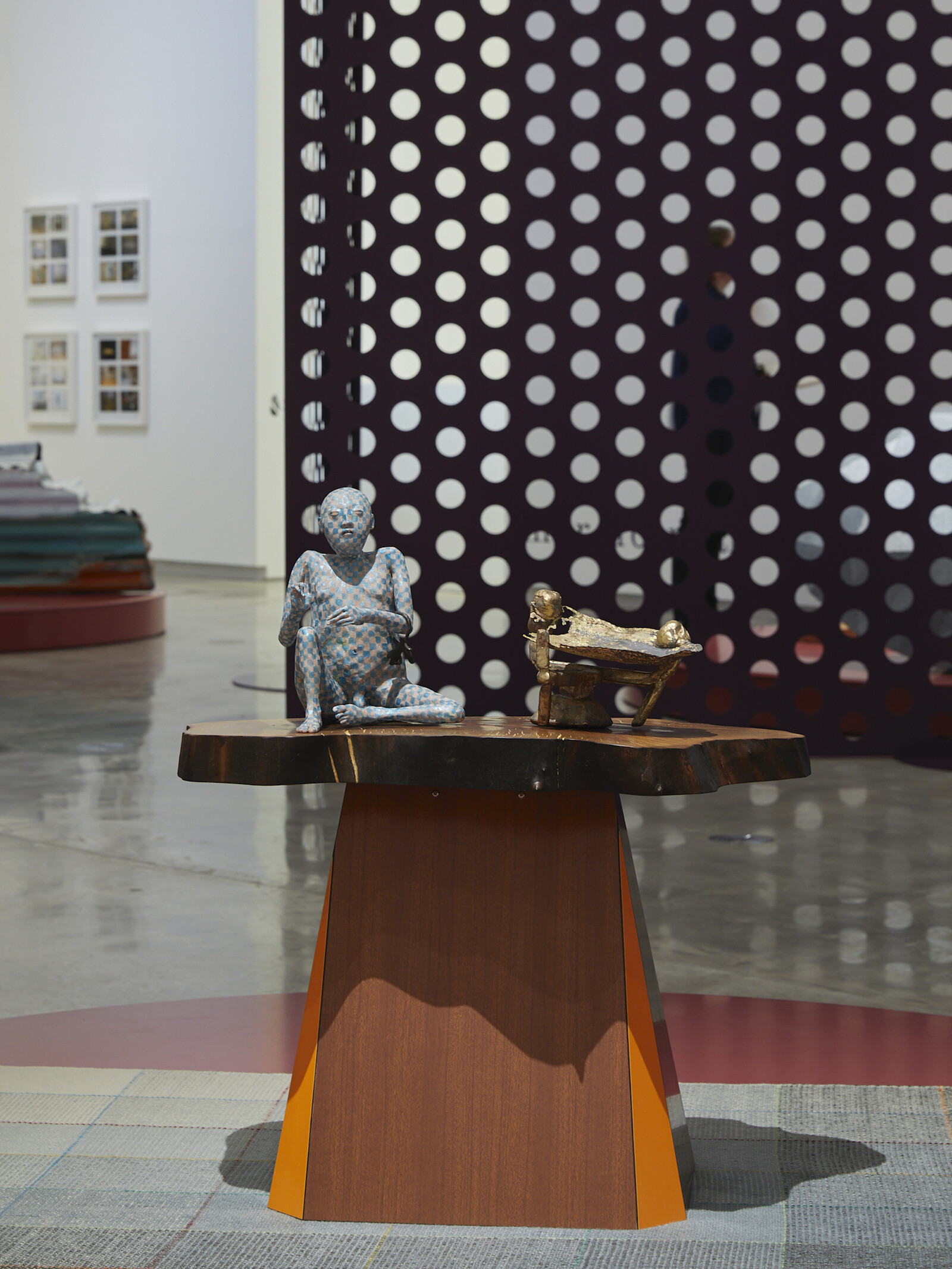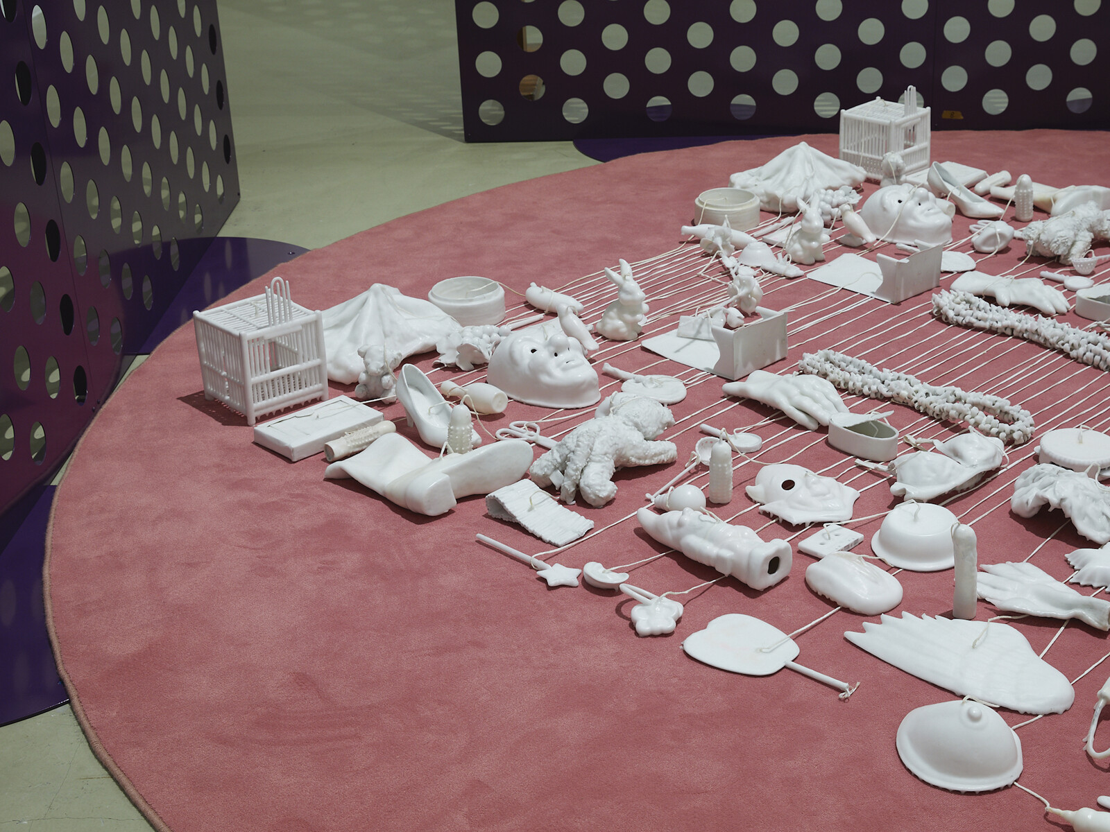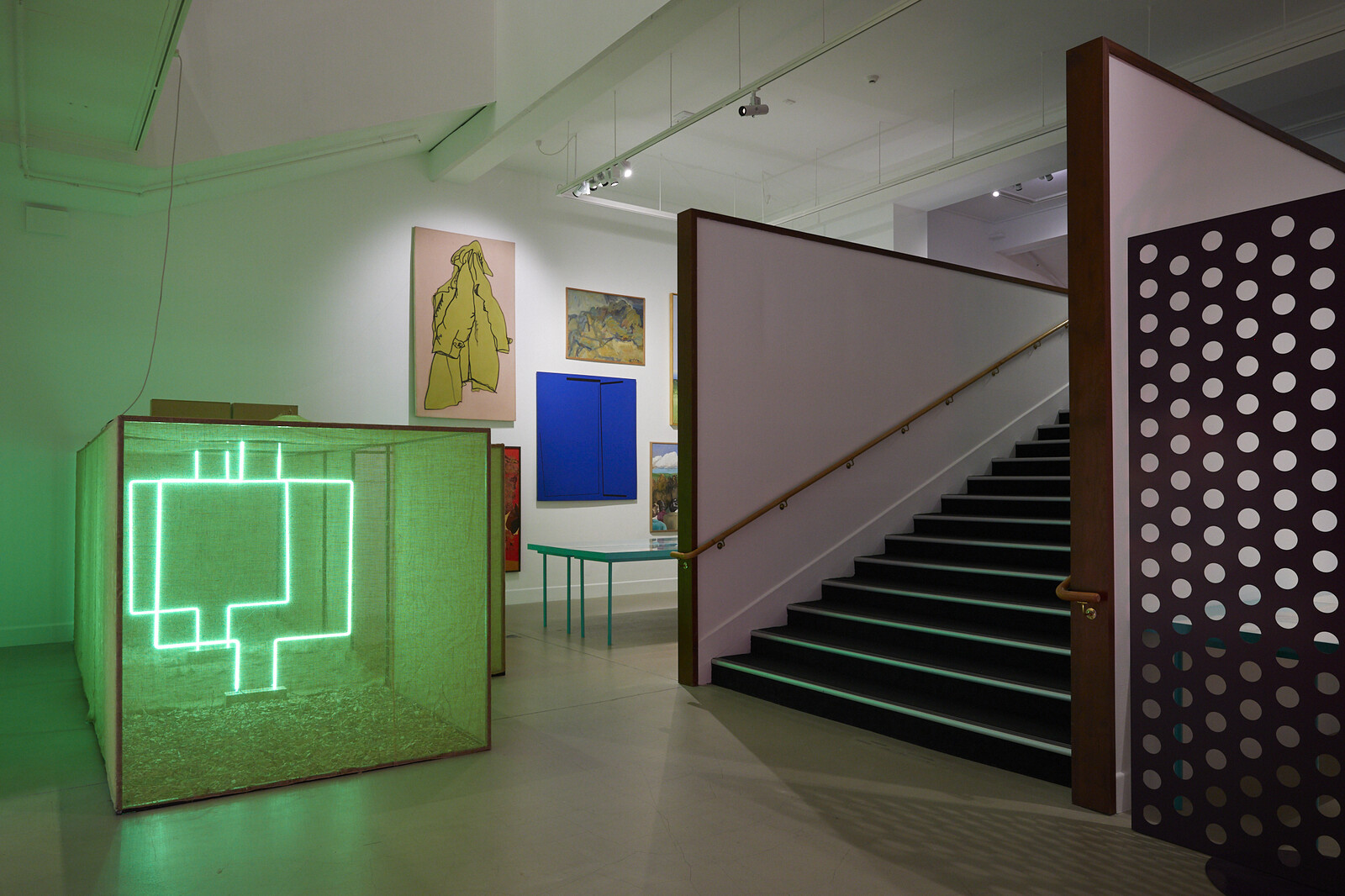Buchanan describes the collection using bodily metaphors. We could think of the collection as a stomach, she told me at the opening, and the artworks like the gut flora, both healthy and unhealthy.4 The collection-as-body is conjured by Buchanan’s essay (“skin, bone, flesh”), her choice of keywords (legs and hands), and her own artistic interventions within the exhibition. These take the form of the booklet, typefaces, and the exhibition furniture Buchanan has made, to which she gives bodily attributes: “purple screens with fist-sized holes punctured into them, the tongue-colored supports, the ‘care’ green vitrines, the washy skin applied to the surface of the building with my brother Benjamin.”5 Buchanan’s round, pink pedestals (Tongues (Plinths), 2019) and liver-purple, perforated, room-dividing screens (When the sick rule the world, 2019) are especially prominent, and coax this crowded exhibition into further maximalism. The exhibition guide continues this thread of thinking the collection as a body: each of its entries, most of them researched and written by curator Kate McKenzie-Pollock, read like biographies, detailing each work’s acquisition and exhibition history. The result is equal parts dissatisfying and thrilling.