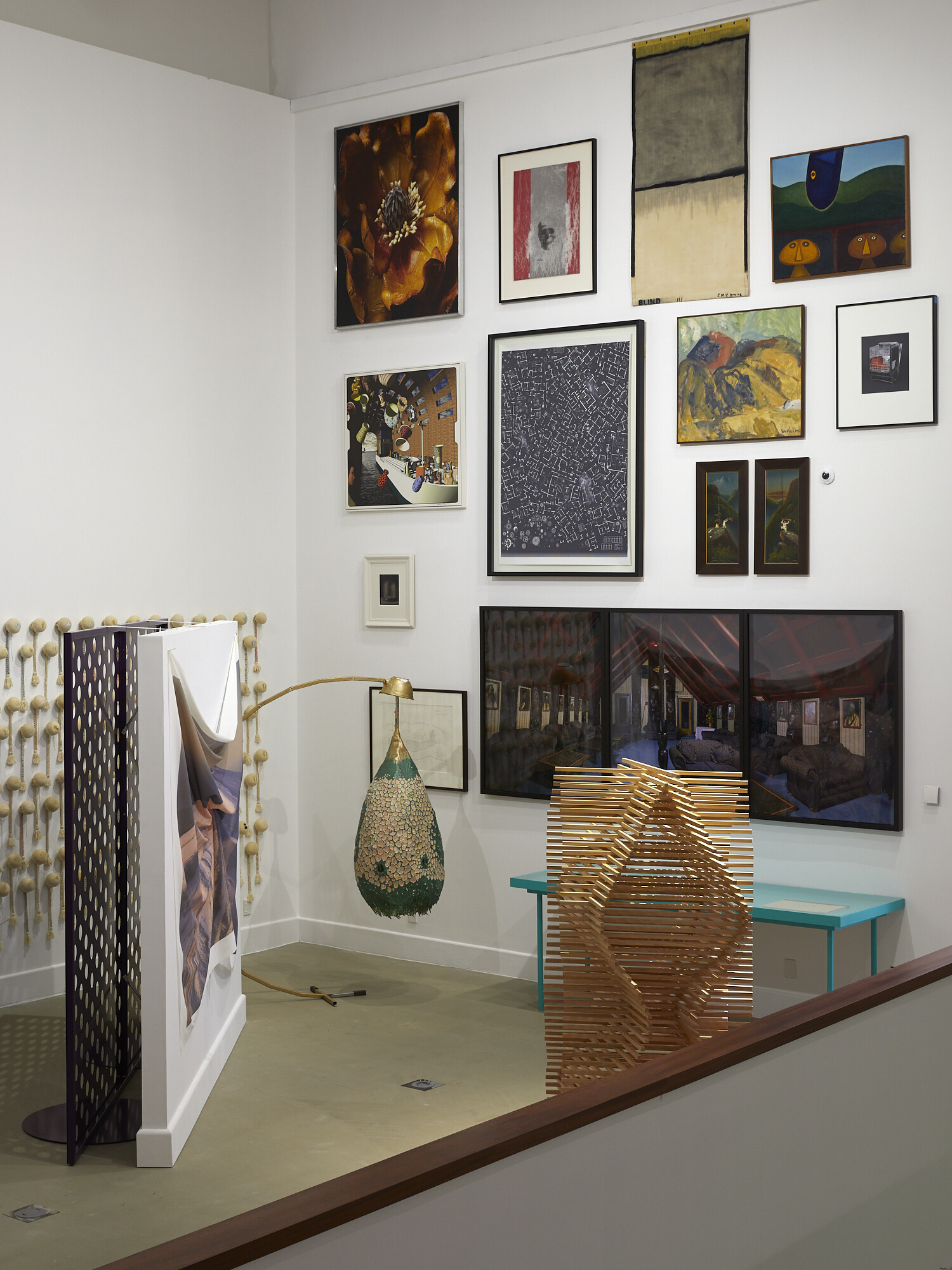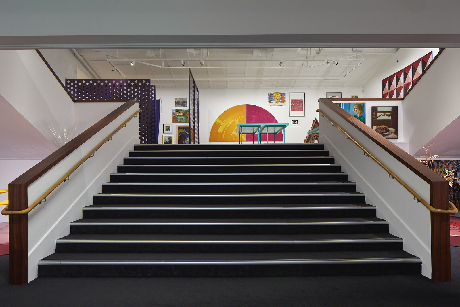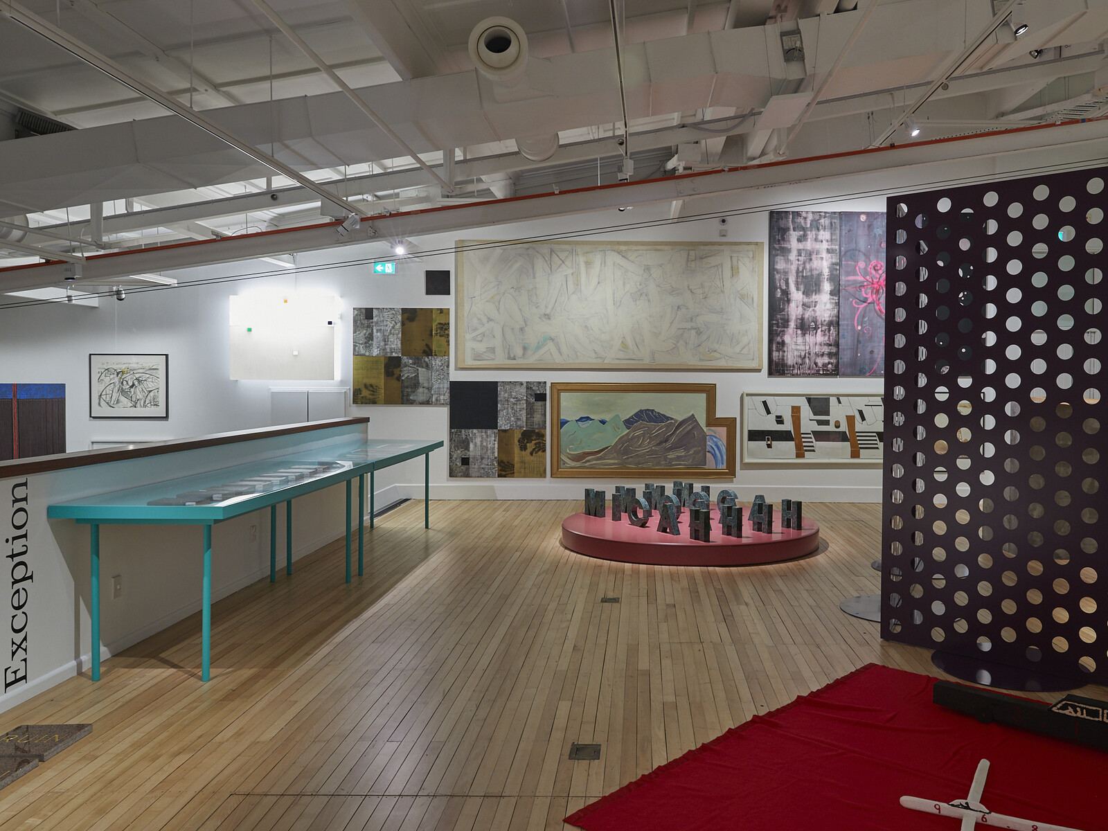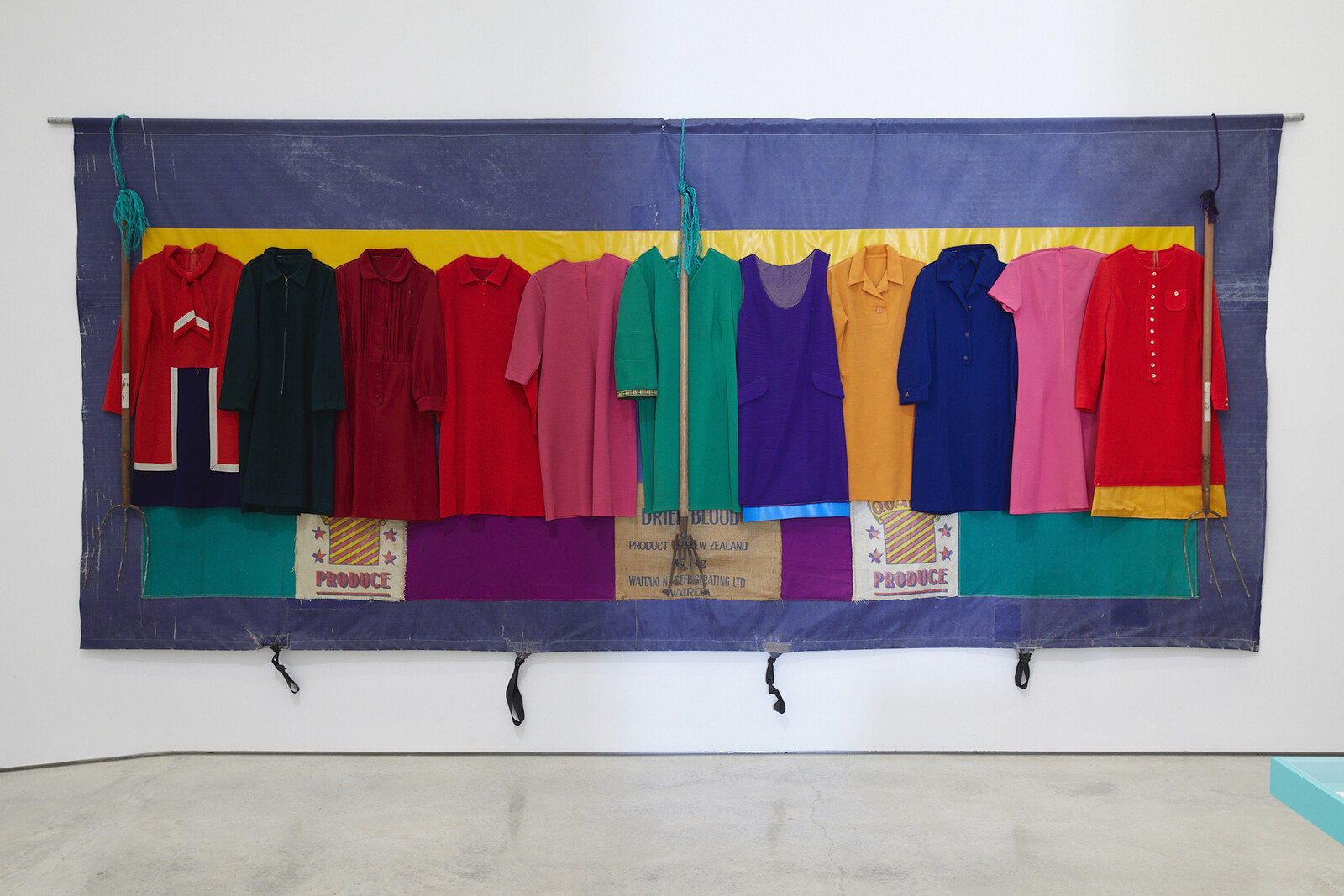 These galleries are full. Full of paintings skied to the ceiling and hung cheek-to-cheek, art in and under stairwells, and massive works sitting uncomfortably next to small ones, given little of the space to breathe afforded by a conventional hang. This is all deliberate. In conversation with preeminent New Zealand curator Christina Barton on the exhibition’s opening weekend, Buchanan described the galleries as “noisy.” Yet within the cacophony of this exhibition, things are just a tinge awkward or ill-fitting or as if they are not where they are meant to be. The feeling that artworks are meant to be somewhere is, of course, an effect of interpellation that is museological as well as ideological. Museums have long been privileged sites of power and wealth, intended to sort, classify, and narrativize art and its history, while displaying for their visitors a shared set of values.