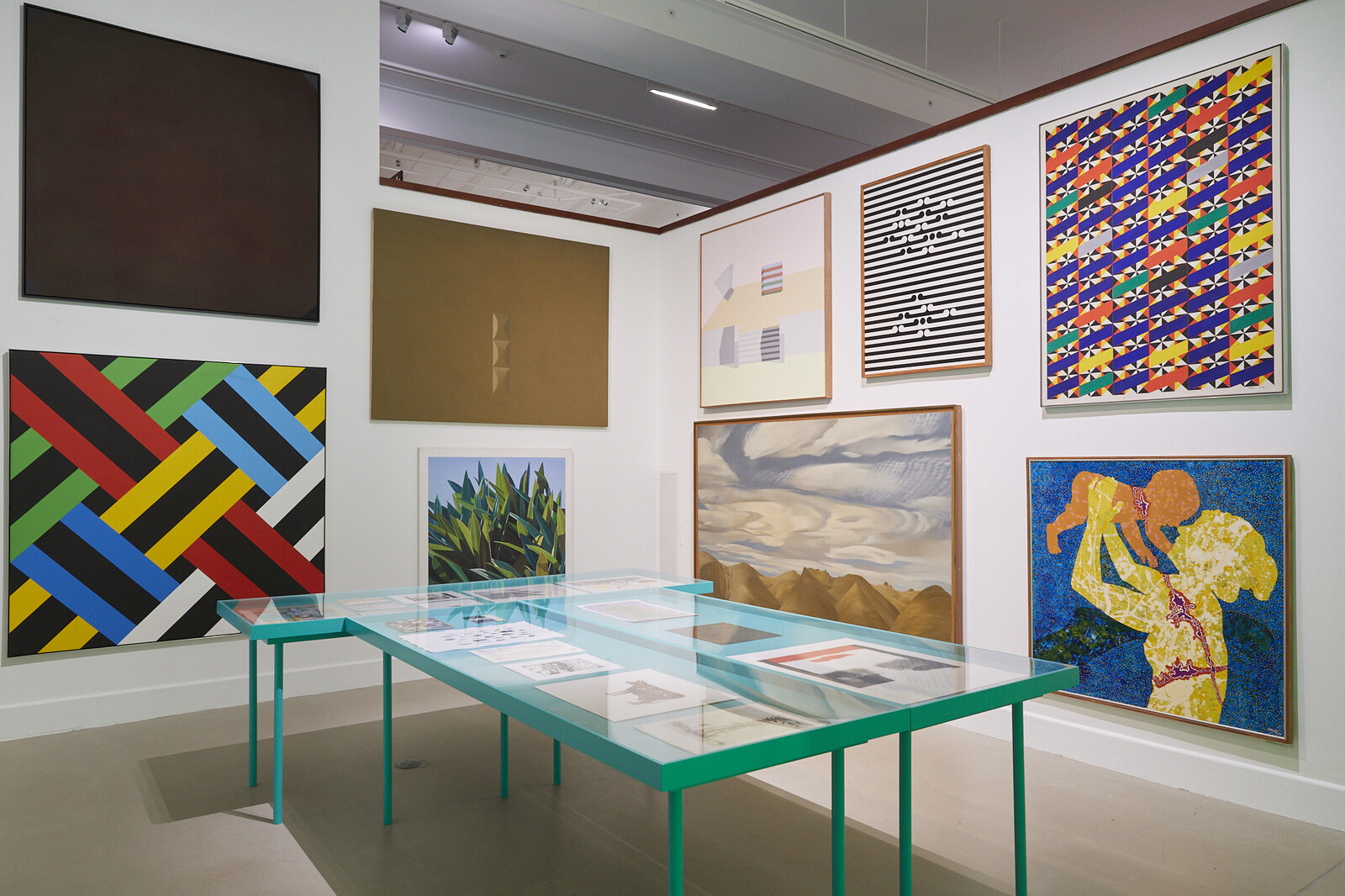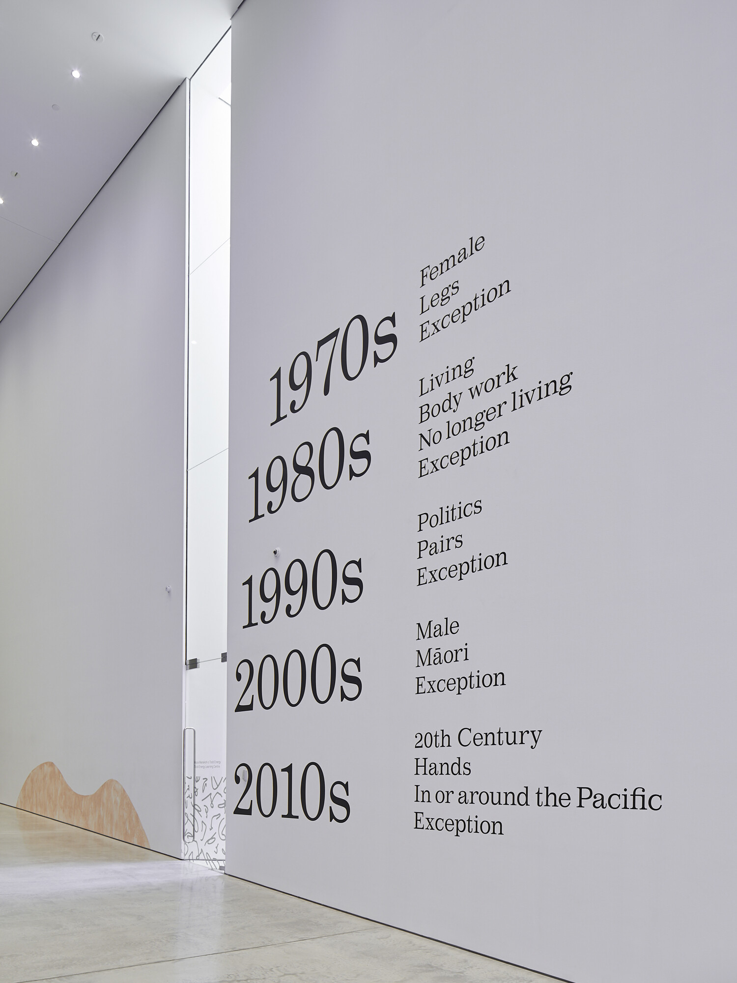 Power has been on Buchanan’s mind. In her thoughtful, searching essay about the exhibition-making process, she explains that a “core question” for her was: “Where is power now?”2 Power at once structures and is revealed by this (any) collection, and her installation aims to put this on display, in all its imbalance and omission. She cultivates this discomfort spatially through her strict display parameters (“to show the first work acquired per artist, per medium, per decade”), a warts-and-all structuralism that makes apparent certain painful facts, like the collection’s underrepresentation of Māori, women, and Pacific artists.3