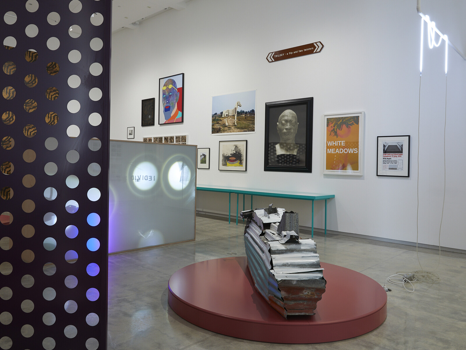 Buchanan is acutely sensitive to language and the body, and these concerns shape her foray into the institution. Her methodology is feminist, seeking horizontal relations, and influenced by Donna Haraway’s “split and contradictory self” and Audre Lorde’s exhortation to “bear the intimacy of scrutiny.”1 Each of the museum’s five galleries is dedicated to a decade in the museum’s fifty-year history, moving from the 1970s to the 2010s. Buchanan has internally organized each gallery using keywords, including “Legs,” “Hands,” “Female,” “Male,” “Living,” and “No longer living.” These labels range from goofy to poignant to revelatory. “Pairs” brings together two works: Maree Horner’s Diving board (1974/1988), a minimalist sculpture pairing concrete “board” and glass “pool,” and Tom Kreisler’s 1 kilo equals 1 pound (date unknown), a photographic screen print showing two piles of sausages, both of which stage a primary relationship between two components. The word “Exception” appears in each gallery, corralling those artworks that don’t fit within the room’s keywords. All the keywords are desperately inadequate to their classificatory or even descriptive task, a failing Buchanan welcomes.