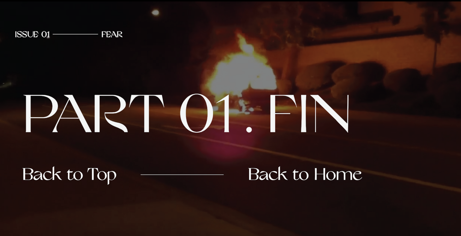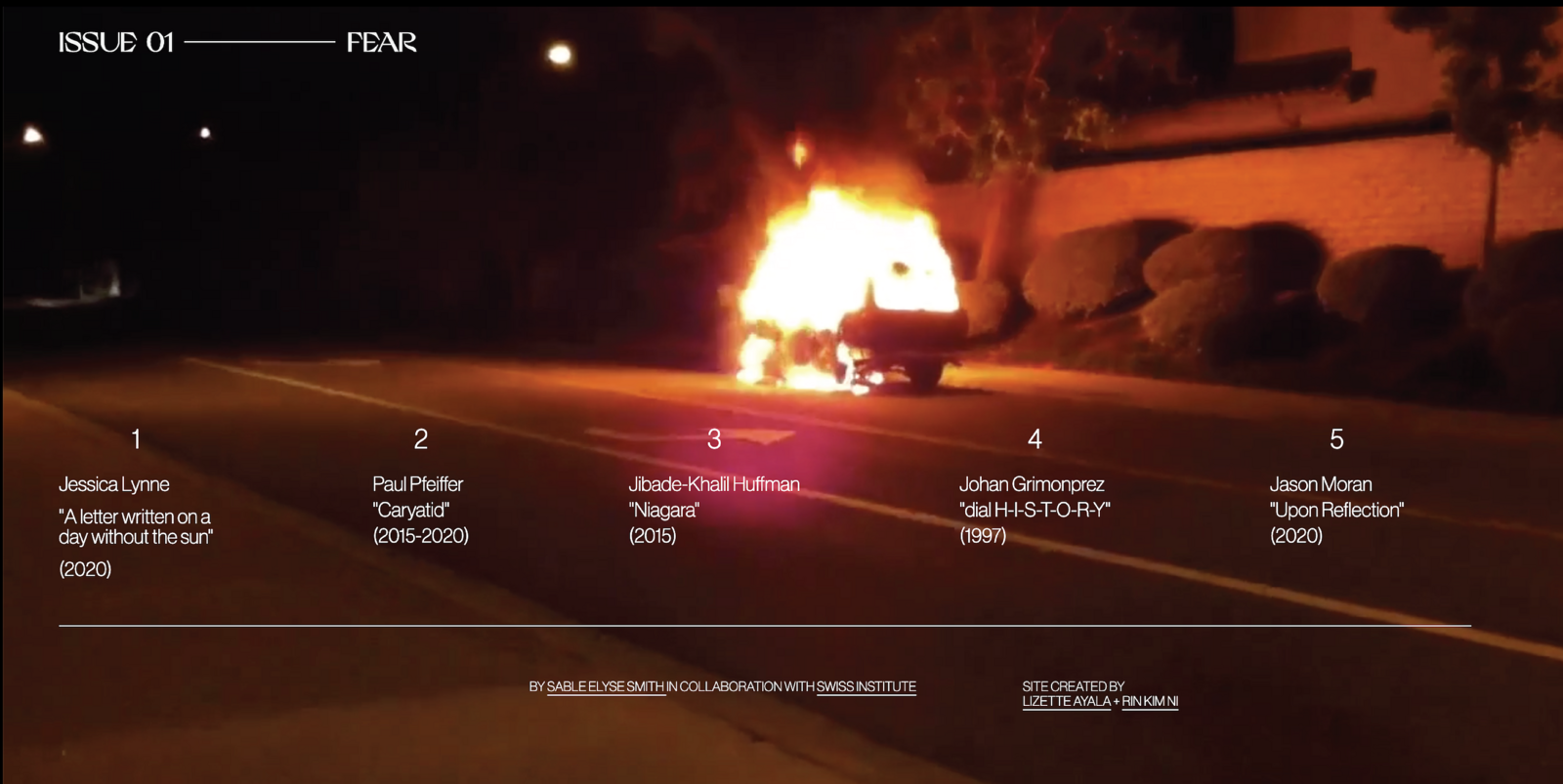 The fire is omnipresent as I scroll down through the five entries that make up “Issue one: FEAR.”1 I zoom into Jibade-Khalil Huffman’s poem, which is printed in infinitesimal letters to the right of the screen, and the fire is there. It explodes around the edges of the embedded screen on which plays Johan Grimonprez’s classic montage film dial H-I-S-T-O-R-Y (1997). “If you are reading this, then you have found yourself in a time consumed by crisis,” writes Jessica Lynne in her contribution entitled “A letter written on a day without the sun,” and the car explodes in the background. Several paragraphs later she writes about her wish for a “place that is not riddled with food insecurity or housing instability or extrajudicial murder or…” and the car explodes again.
