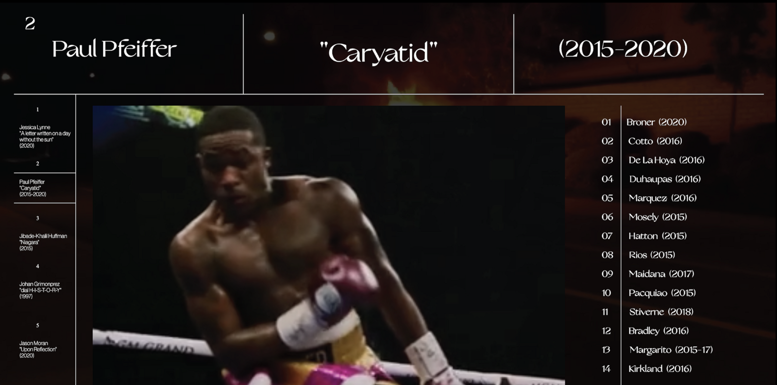 Neither the fire nor the explosion is a shock; it is just the ground for Smith’s work of synthesis and juxtaposition, of building tension and allowing it to temporarily release. And it is the ground for this moment in the history of the US. Like the camera that jolts but then immediately recenters on the image of the car in anticipation of the next explosion, like the boxers’ bodies in Paul Pfeiffer’s Caryatid (2015–20) who take an invisible blow, struggle for balance, then take another, the viewer knows what is coming.