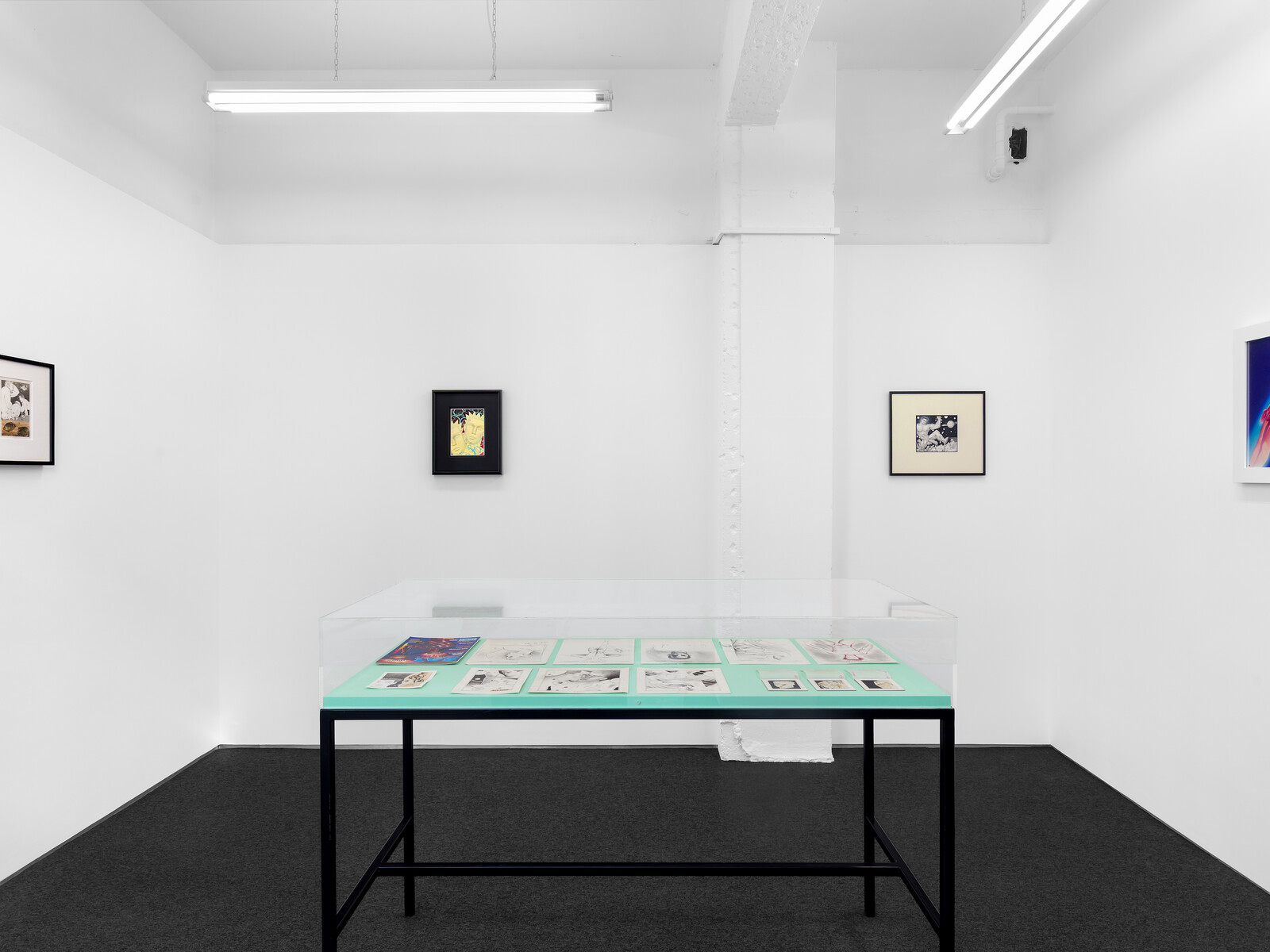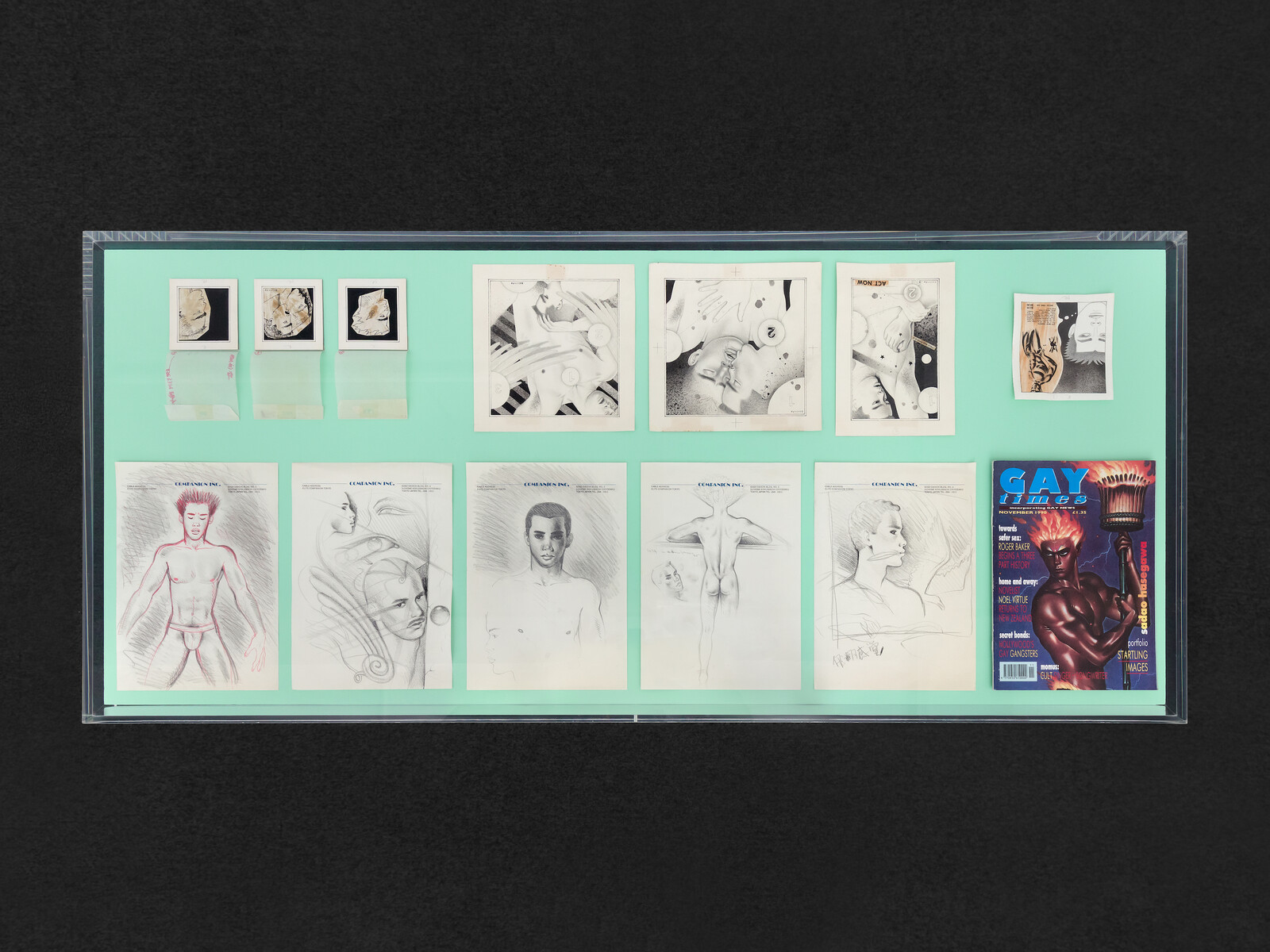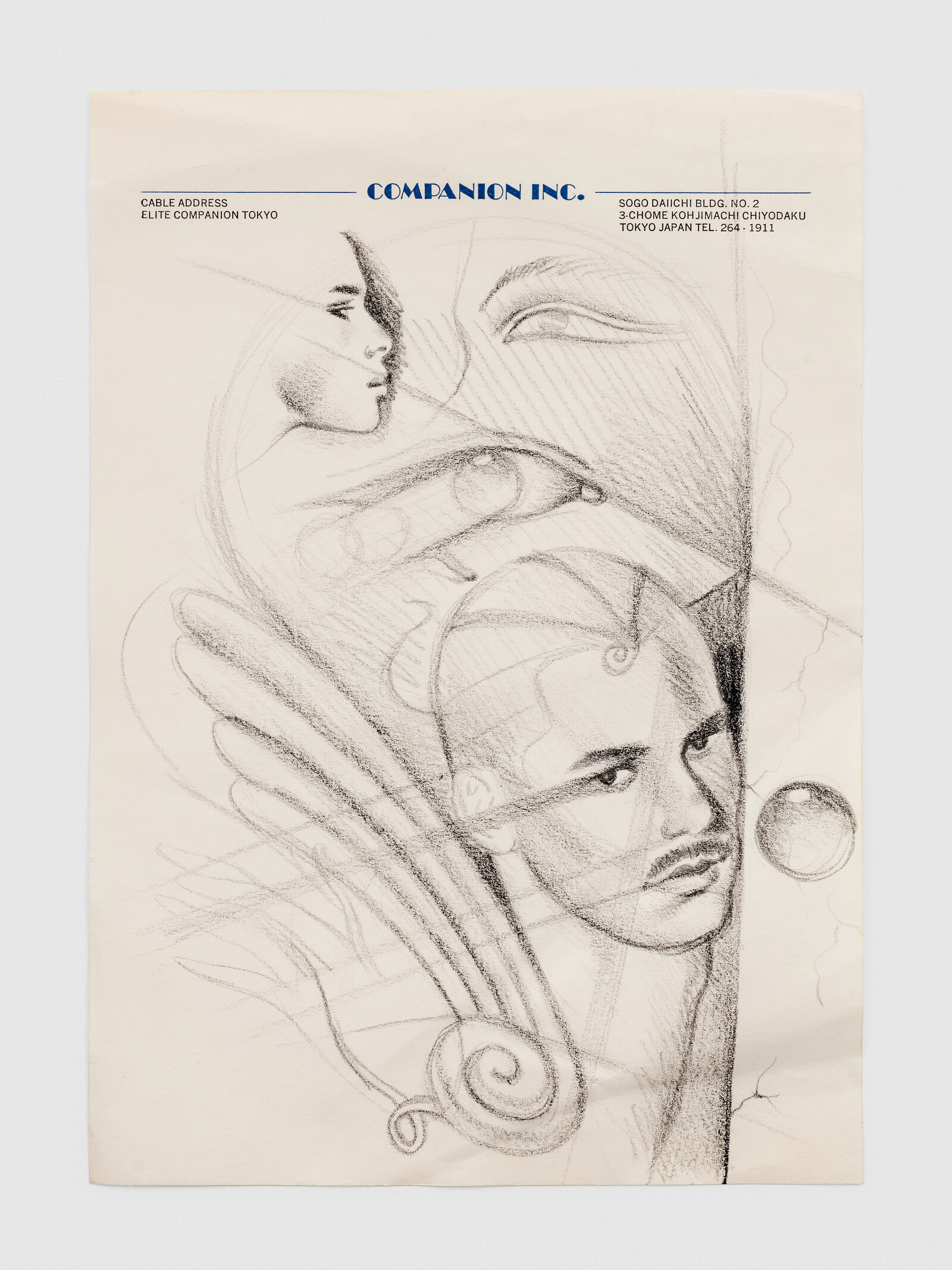 From the late 1970s until his death in 1999, Sadao Hasegawa was one of postwar Japan’s most prominent illustrators, and a major figure in the country’s burgeoning industry of gay magazines.1 This collaboration with Tokyo’s Gallery Naruyama—which has handled his estate since his suicide—is Hasegawa’s first solo show outside Japan: although his paintings and drawings were reproduced in magazines in the US, UK, and Australia, his concern that their erotic content would land him in trouble with Japanese customs prevented him from shipping them to arts institutions overseas. Suggestively titled after the corporate letterhead of paper on which he sketched, it presents a focused selection of works in a vitrine and on the walls of one small room, consisting mainly of designs for magazine prints—some of which still have their marked-up overlays.