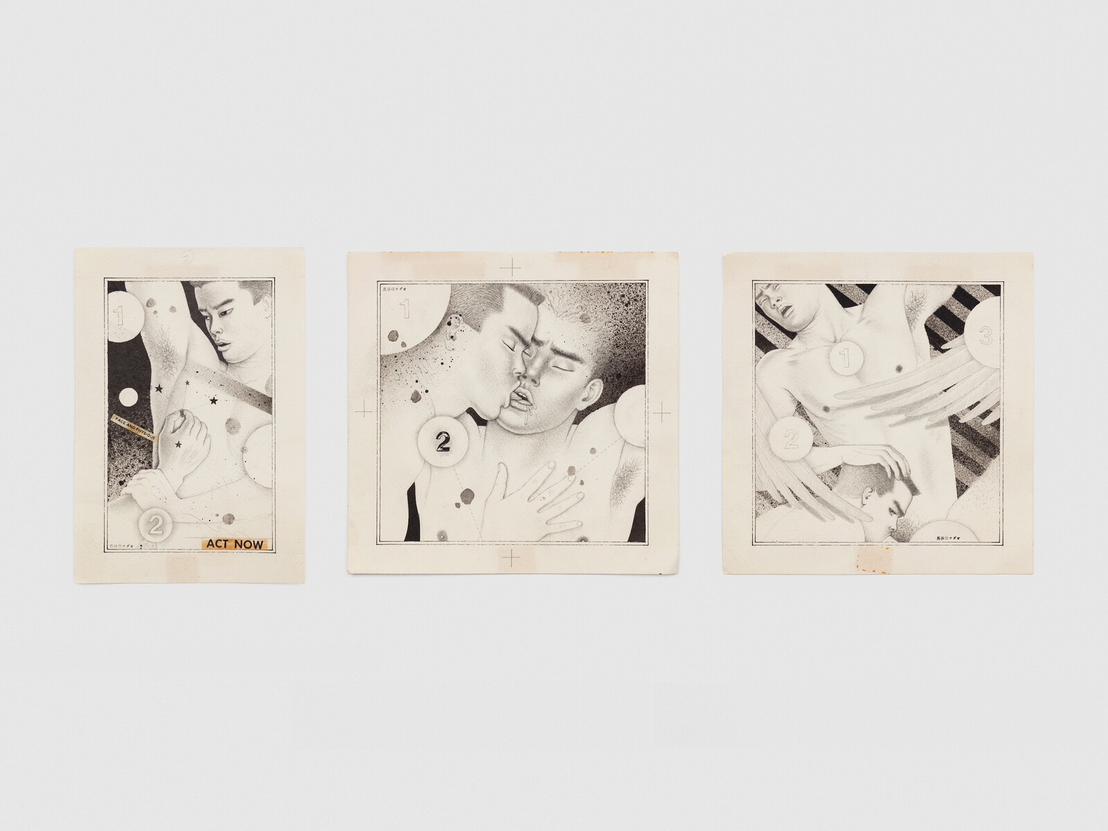 The self-taught Hasegawa reportedly named as key influences Tom of Finland and Go Mishima, the latter renowned for his illustrations of yakuza-tattooed men.4 But what distinguishes Hasegawa is the limitlessness of his world—where men can fuck each other as much as they want, without societal, national, or even species constraints. While he often explored Japanese tropes—kabuki, shunga—this exhibition emphasizes the perviousness of his view of culture and ethnicity, which he abstracted and amalgamated through a futuristic-mythological lens. The letterheaded drawings (ca.1979) show him layering and merging facial features, at times introducing non-human appendages such as wings or leaves—searching for a pan-Asian, mythological male beauty to be his utopian body politic. The artifice of his endeavor is referenced in a 1983 design for the cover of Samson magazine, with dotted lines marking out the symmetries of two godlike heads.