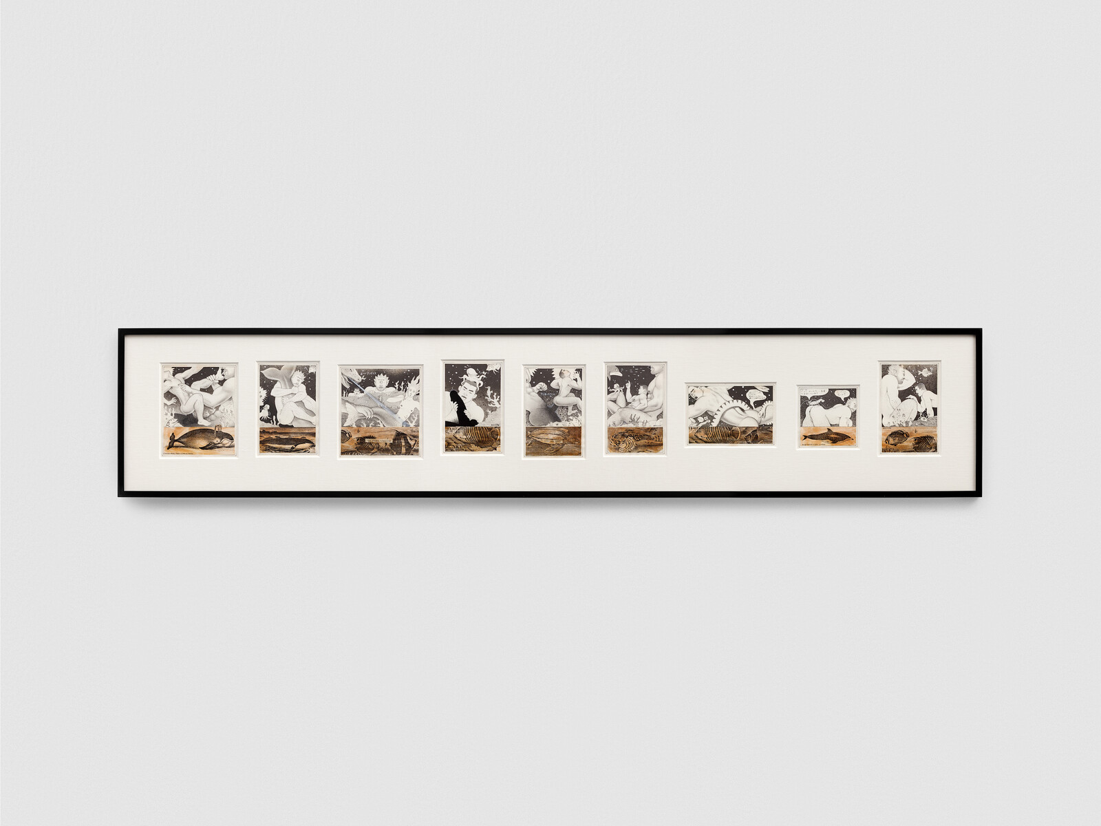 Along one wall, an exquisite suite of drawings (1980s) depicts the deep-sea sexual misadventures of a one-eyed giant (the phallic suggestion was unlikely lost on Hasegawa), his crewcut hunk, and their pet octopus with a bellend for a head. This mollusk is often seen waving a poxy Japanese flag—queering both “tentacle erotica” and nationhood, with the trio inhabiting an indeterminate “Japan” unto their own. Collaged at the base of each drawing is a print depicting a marine animal cut from a book of illustrations originally drawn by the nineteenth-century English naturalist Richard Lydekker, Hasegawa undermining their heteronormative authority with humorous juxtapositions; a spouting whale, for instance, reads as ejaculatory beneath the wildly copulating men. Thus Hasegawa used the gay magazine as a site of erotic fantasy that—by being counterfactual—was also backhanded critique, creating a queer-ecological utopia in which nation and nature are boundless.