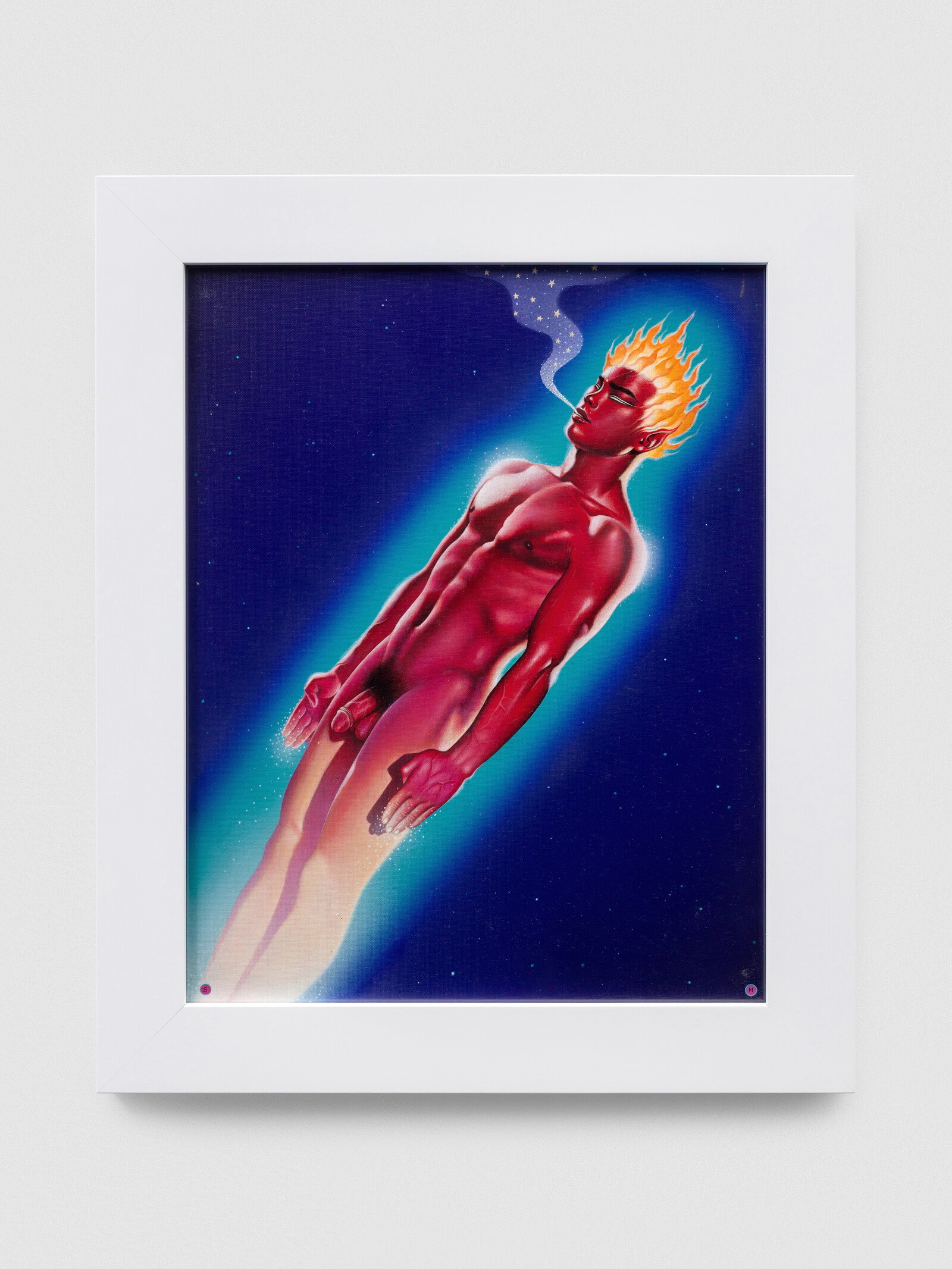 There is no place more limitless than outer space, a backdrop to which Hasegawa frequently returned. In the show’s only painting, That Floating Feeling (1980), a naked man sleeps or meditates in a celestial haze, a jewel between his eyebrows resembling a Buddhist urna, while his crimson skin and flaming hair liken him to Agni, the Hindu god of fire. A similar deity reappears brandishing a torch on the cover of the November 1990 issue of Gay Times, displayed in the exhibition’s vitrine. It feels pertinent that Hasegawa’s invocation of ancient spirituality allows for magic independent of technology—no spaceships, no “goggles”—in the era of Blade Runner (1982), when Japan was being increasingly orientalized (pronouncedly in this popular film’s exoticizing representation of the Japanese) on account of its hi-tech industry, as a place that existed only in the future.5