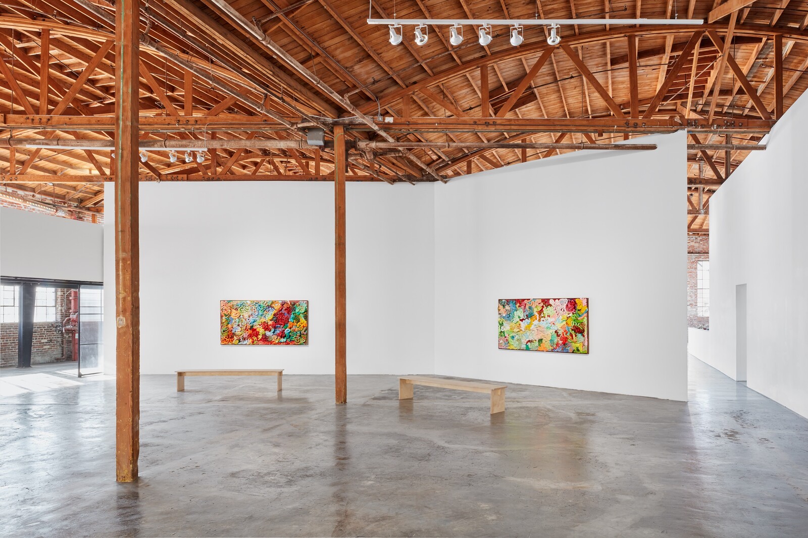 Samara Golden’s “Guts,” the inaugural exhibition at Night Gallery’s new venue in downtown Los Angeles, offers a direct, physical encounter with fantastical perceptual experience. In this warehouse space, Golden has installed a huge mirrored box titled Guts (2022). Looking into it from one of two walkways reveals three white “floors,” each of which holds two “scenes” (one above and one below) relating to Golden’s shifting psychological states over the past few years: a messy living room with its toppled furniture, lamps, and crushed beer cans; an iridescent blue water-like surface; and an array of snaky, muted pink and lavender intestinal shapes that evoke the title of the installation, which gives its name to the exhibition. The effect is of one building contained within the atrium of another, extended vertically in a vertiginous series of reflections. It is a demanding task to distinguish between “real” installations and their mirrored reproductions.