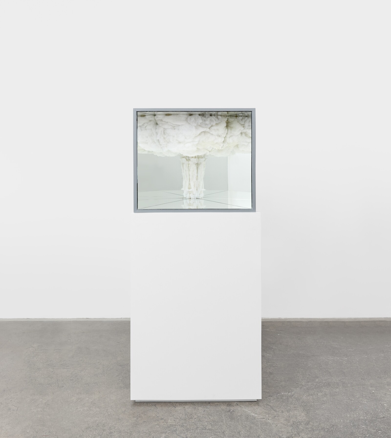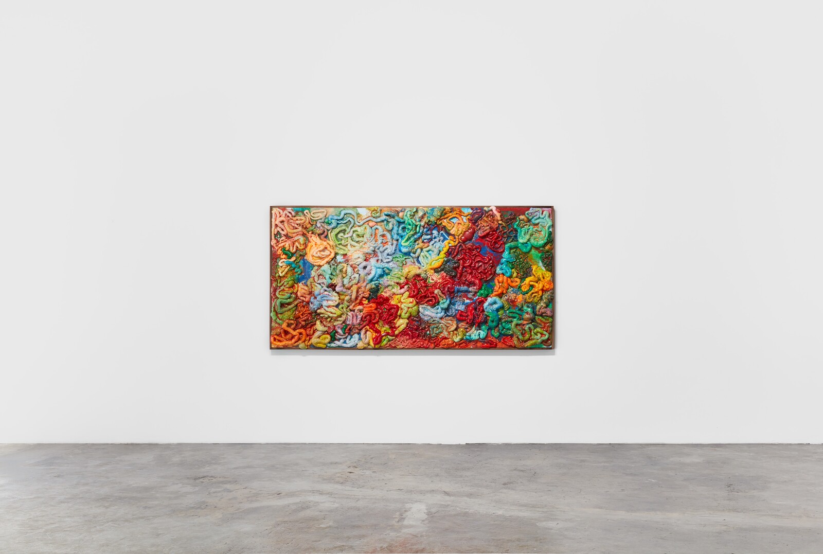 Guts are also present in two other works in the exhibition, Guts painting 1 and Guts painting 2 (both 2022): roughly four-by-eight-feet sculptural paintings that extend outward from the wall eight inches, slews of colorful intestinal shapes reminiscent of those in the installation, but compressed into tight walnut frames. Another spray foam sculpture, this one of a miniature, cloud-like bomb mid-explosion, is held within a triangular mirror in Nuclear Bomb (2022), a maquette of the technique Golden employs at a larger-than-life scale in the main installation.