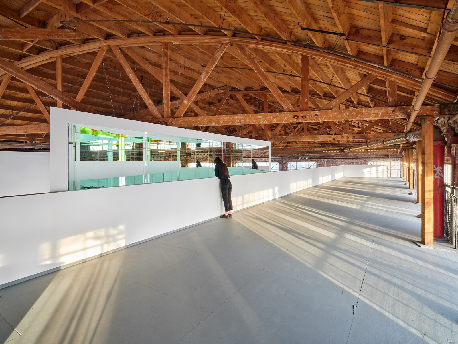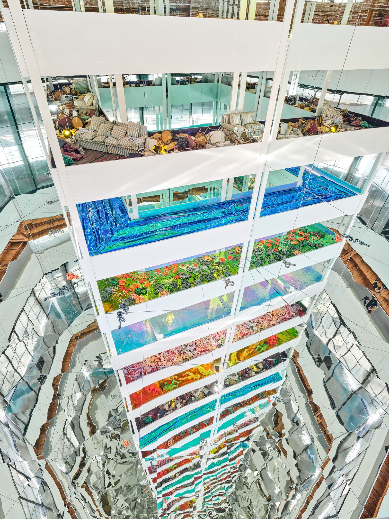 Guts builds on Golden’s previous site-specific installations using mirrored structures. The Meat Grinder’s Iron Clothes (2017), for instance, was included in the 2017 Whitney Biennial and staged handmade furniture to create miniature “sets” of scenes of everyday life. In the context of a shift towards virtuality and digitization accelerated during the Covid-19 pandemic, Guts imagines an enhanced reality set firmly in the tangible world. Drawing on imagery from the artist’s subconscious, the installation also conjures the ghostly, emptied-out office buildings that became ubiquitous across the United States during the shift to remote working. Here, the gutted insides of these corporate megaliths have been replaced with ludic and lucid scenes that drift between Californian luxury (a glimmering, neatly tiled pool, a stray towel poised on its edge) and abjection (a swath of fluorescent guts and bright red crabs, or loosely formed, equally vibrant bodies fabricated in expandable foam and splayed across a gold floor). The guts of the title might refer to the courage it takes to survive in these disorienting times, or call to mind the gooey underbelly of corporate capitalism.