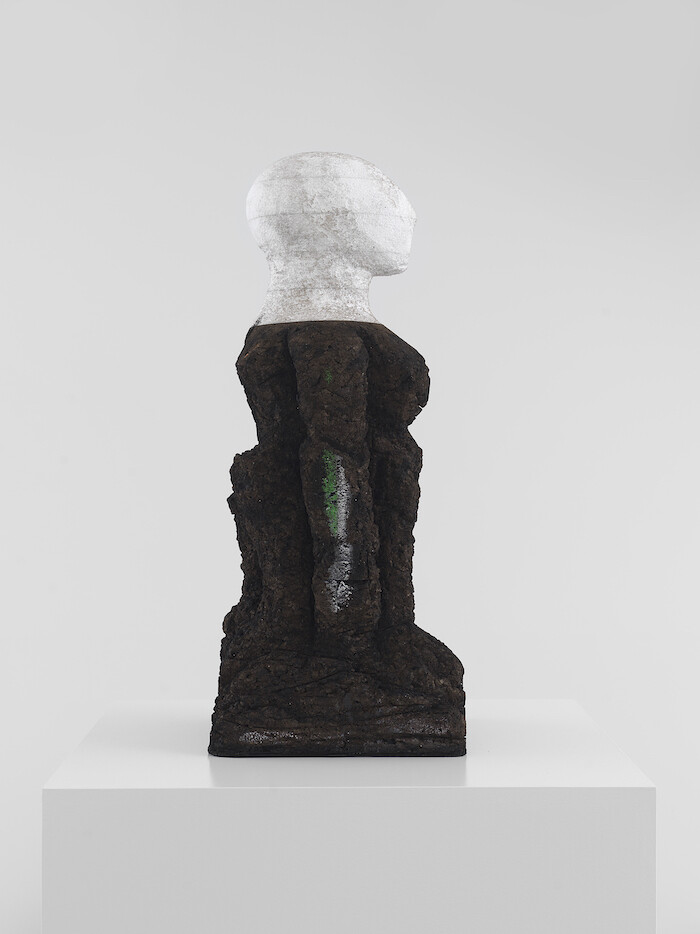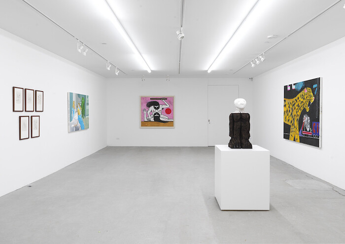 In the room downstairs, there’s a set of lovely, furtive illustrations by Christopher Forgues, inky comic book-like characters peeking around walls or trapped as avatars, drawn on the grid of a calendar. I can smell the cork off Huma Bhabha’s sculptural humanoid Past Life (2018). The leggy bottom half looks like rotten wood or burned charcoal, the feet and toes curled in gargoylish repose; the Styrofoam head has no face but still it stares at me. In Ellen Berkenblit’s Captain of the Road (2018), a leopard growls at the industry surrounding it. Nurses of Gamma (2018) by Gary Panter is set in a cold hospital-cum-spaceship, three nurses rushing to save a patient as a big green one-eyed alien looms behind them.
