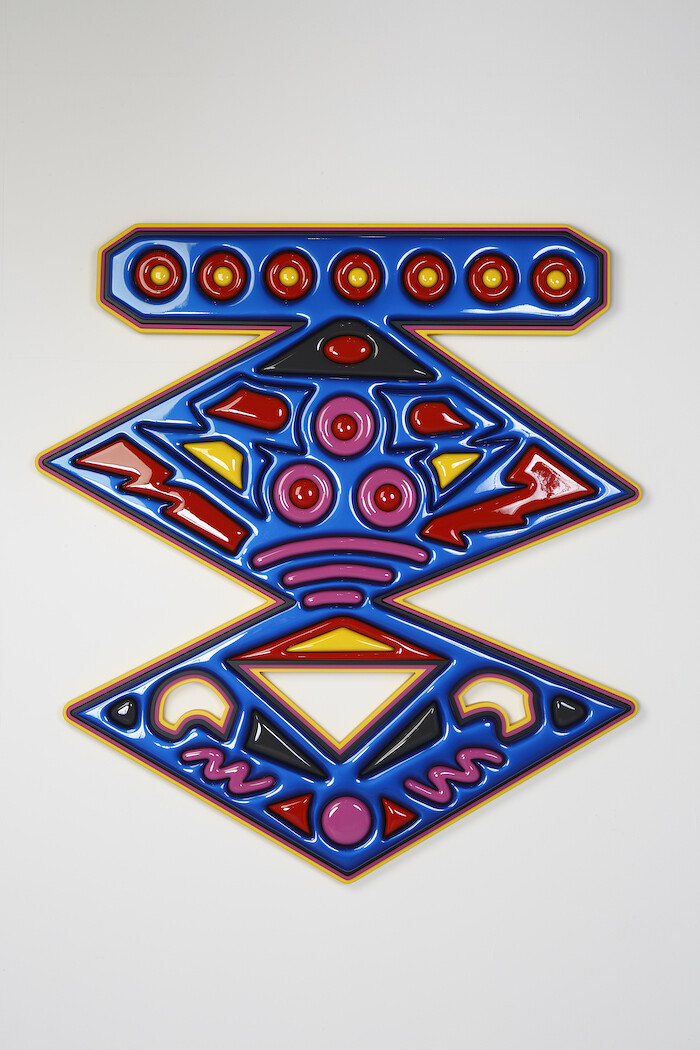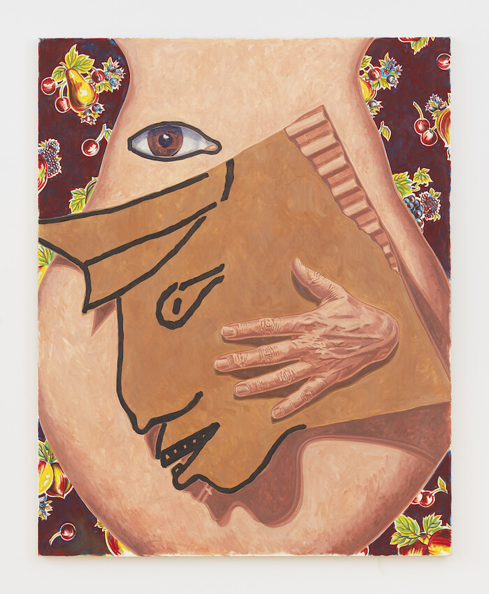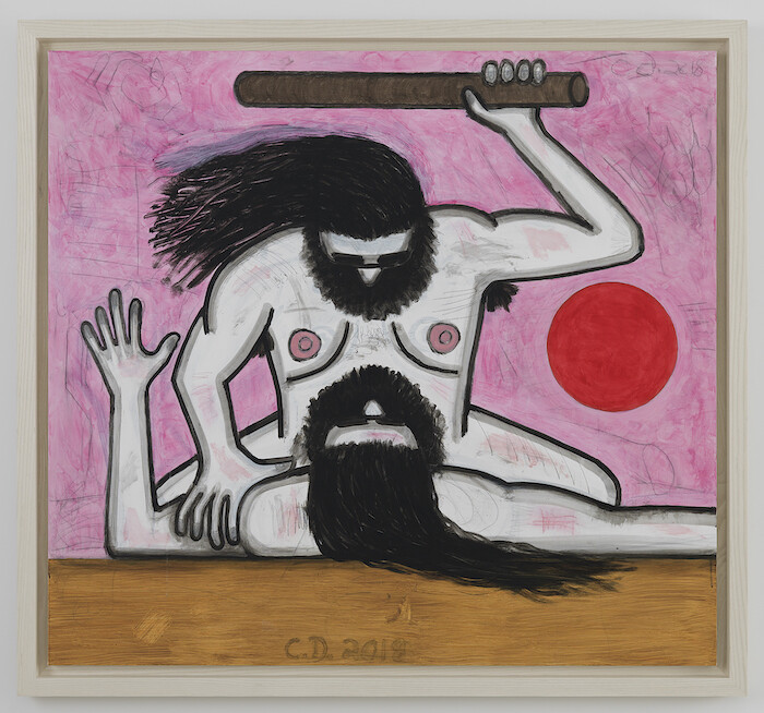 All the figures—human, animal, alien, mutant—reflect Nadel’s interest in psychedelic pop and anti-modernism. While the presentation of works can feel cold and institutional, the variety of worlds and styles represented by the selection has a centrifugal effect, spinning me out in too many directions. Mike Kelley’s Free Gesture Frozen, Yet Refusing to Submit to Personification (Violet Fingerpainting) (1998)—violet smudges on wavy wood, which resembles an abstraction of the teddy bears Kelley employed elsewhere in his work—contrasts with Carroll Dunham’s untitled 2018 painting of a nipply man pinning down another, about to strike him with a baton. Though quite different, Kelley, Dunham, Panter, and Brown serve as arch-influencers for the exhibition: in an email, Nadel told me that all the artists in the show would probably cite at least one of them as influences. This, along with the fact that all of them engage in figuration, sums up the conversations these pieces are having.