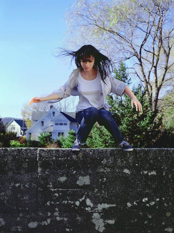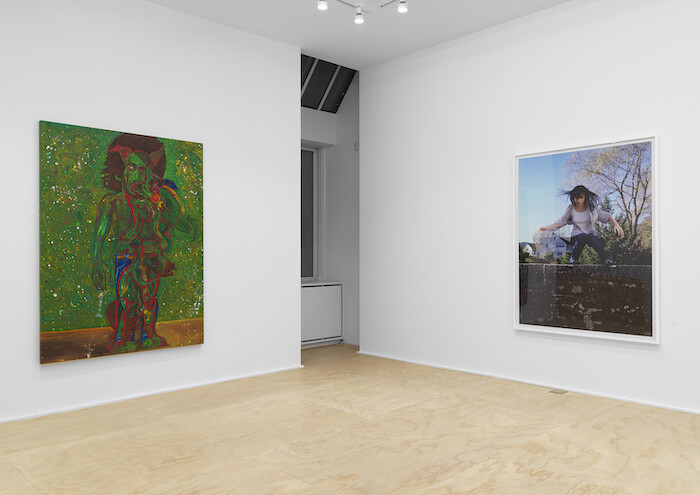 On a wall in the first room is Xeno (2017) by Takeshi Murata, a slick, totemic, geometric sculpture whose enamel paint glows like radioactive candy. On the wall adjacent is The Golden Age: The Jaguar and The Tapir (1985), a huge painting by Joan Brown with the titular animals in the foreground, eyes fixed on the viewers. In the next room, there’s Jason Fox’s Jekyll (2018), a pair of verdure and blood-red figures transposed atop one another. One seems to be smoking a gigantic joint. I’m surrounded by figures and figuration: Sarah Peters’s conjoined two-headed sculpture Glossolalists (2019), Laurie Simmons’s creepy photo of a doll uneasily bestriding a wall (The Love Doll / Day 25 (The Jump), 2010), Alan Turner’s painting of a disembodied hand and what seems to be a fleshy vase, eye protruding (Mask, 1993). The effect of all these bodies and body parts is such that, even with Joe Bradley’s simple wooden box in the middle of the room, I sense that there’s maybe someone or something waiting inside.