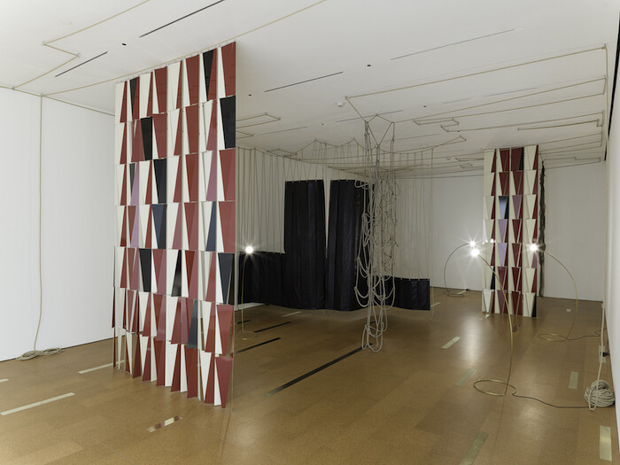 The most exciting work occurs in the few artist commissions sprinkled throughout the building, which are swallowed by the grandiose group shows unless you seek them out. Leonor Antunes’s constellation of six interconnected sculptures forces an awareness of the surrounding architecture, and formal elements coalesce with historical references in an environment set apart. Thick black leather sheets hang from rope attached to the ceiling in discrepancies with backus house (all works 2016) while five lamps, modernist light fixtures that sprout from the floor, illuminate the area. A skylight alley running sideways, a three dimensional grid of red, off-white, and black brass triangular plates, is inspired by a lamp designed by Greta Magnusson-Grossman; a delicate hanging piece, a spiral staircase leads down to the garden, references Bay Area artist Ruth Asawa; and enlarged with verticals is a floor piece based on a weaving by Anni Albers. These nods to twentieth-century female artists make even more apparent the lack of women (not to mention artists of color) throughout the rest of the museum. Outside of SFMOMA it’s actually a good moment for female artists in San Francisco, with important solo shows by Laura Owens at the Wattis,(1) Mariana Castillo Deball at San Francisco Art Institute, and Yin-Ju Chen at Kadist.