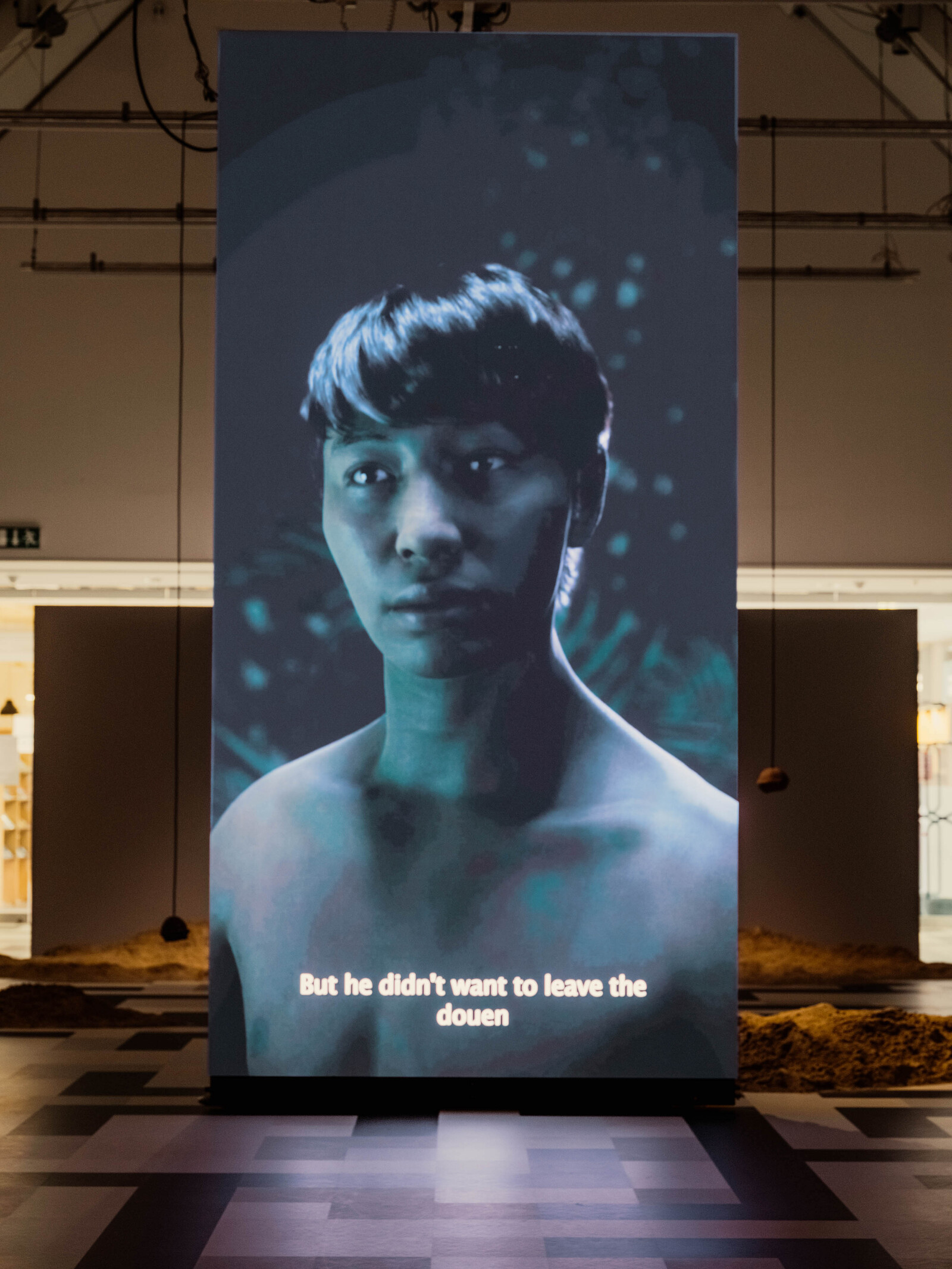 I enter the video loop during a scene in which a slender mushroom is slowly growing towards the top of the screen. When it reaches its full height, the fungus begins to wilt under the weight of its own cap. On the voiceover, someone is telling a story of warning; do not call the names of your children, lest the Trinidadian spirit-creature called the douen learns their voices and calls their children into the forest, never to return. The pattering rhythm of the surrounding sound installation deepens the soft feeling of threat in this fable about speech.