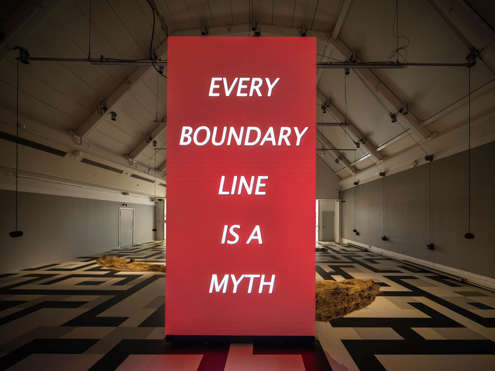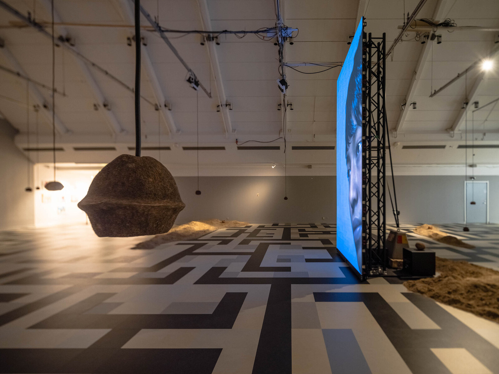 In the center of the exhibition hall is a flat dark form with the dimensions and inscrutability of the infamous monolith from Stanley Kubrick’s 2001: A Space Odyssey (1968). As I approach, I realize that this intimidating stele is composed from the back sides of LED screens. A video plays on the front, rising from the piles of sand and the geometry of the floor installation with the intense glow of an animated advertising billboard in public space—luminous and visually inescapable. Again, I am struck by the choreography of Mostyn’s installation, the way it engages all the senses so that the viewer is prepared to submit to the moving image completely.