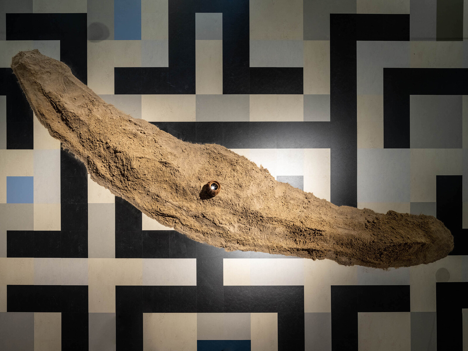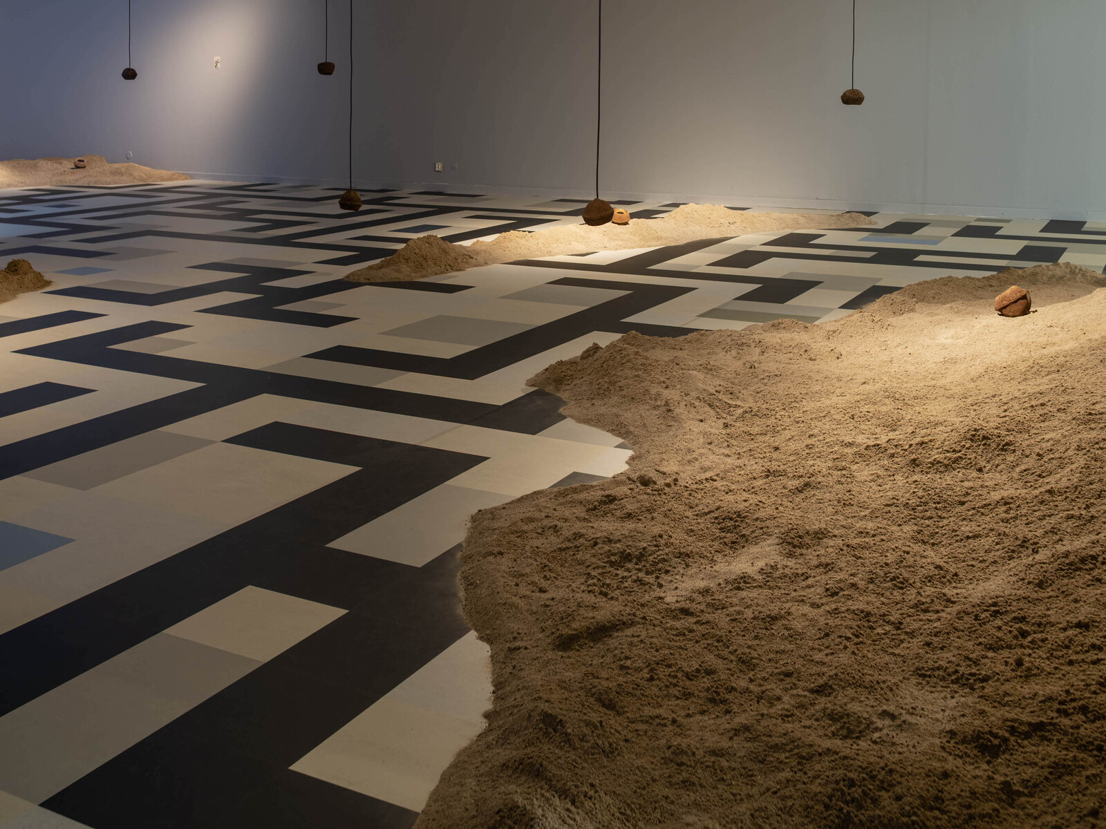 The floor beneath Mostyn’s piles of sand is a permanent artwork by the design duo Laercio Redondo and Birger Lipinski, entitled Opacity (for Édouard Glissant) (2021). Inspired by indigenous weaving techniques in the Americas, it is an abstract geometrical pattern made with rectangular flooring panels in beige, navy, and powder blue. The design reminds me of a disarticulated Catholic labyrinth, a geometric pattern inlaid in stone on the floor of cathedrals during the Middle Ages, that provided a score for perambulatory meditation. Mostyn’s installation of sand and Brazil nut shells floats above this bizarrely named intervention, neither confirming nor denying its right to claim Glissant’s legacy. And this distanciation works—it creates a pause between the work on view and its institutional foundation. It evokes the dream state.