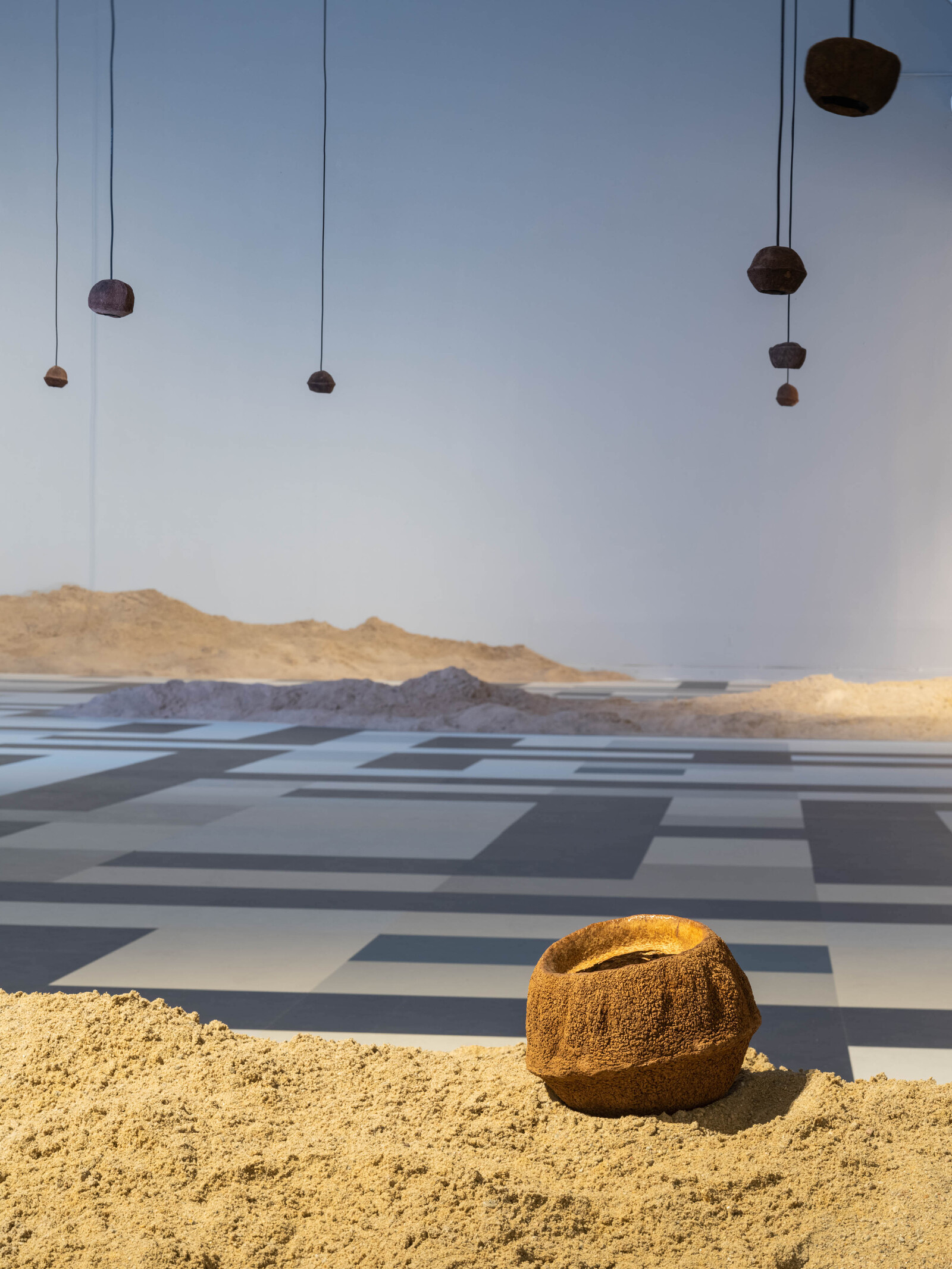 Santiago Mostyn has placed low banks of sand at rhythmic intervals throughout the large, open exhibition space of Södertälje Konsthall. Brazil nut casings lie scattered on top of the sand; they are also suspended from the ceiling, each shell holding a speaker. A soft clicking animates the room, as the eighteen-channel sound work emanating from the shells thickens the space at the periphery of my senses, like a subliminal awareness of thriving insect life. Looking down, I notice that viscous liquid fills one of the empty shells to resemble brackish rainwater trapped at the bottom. One shouldn’t leave water standing in the tropics, it invites mosquitoes to breed, I think, and realize that my mind has left the outskirts of Stockholm.