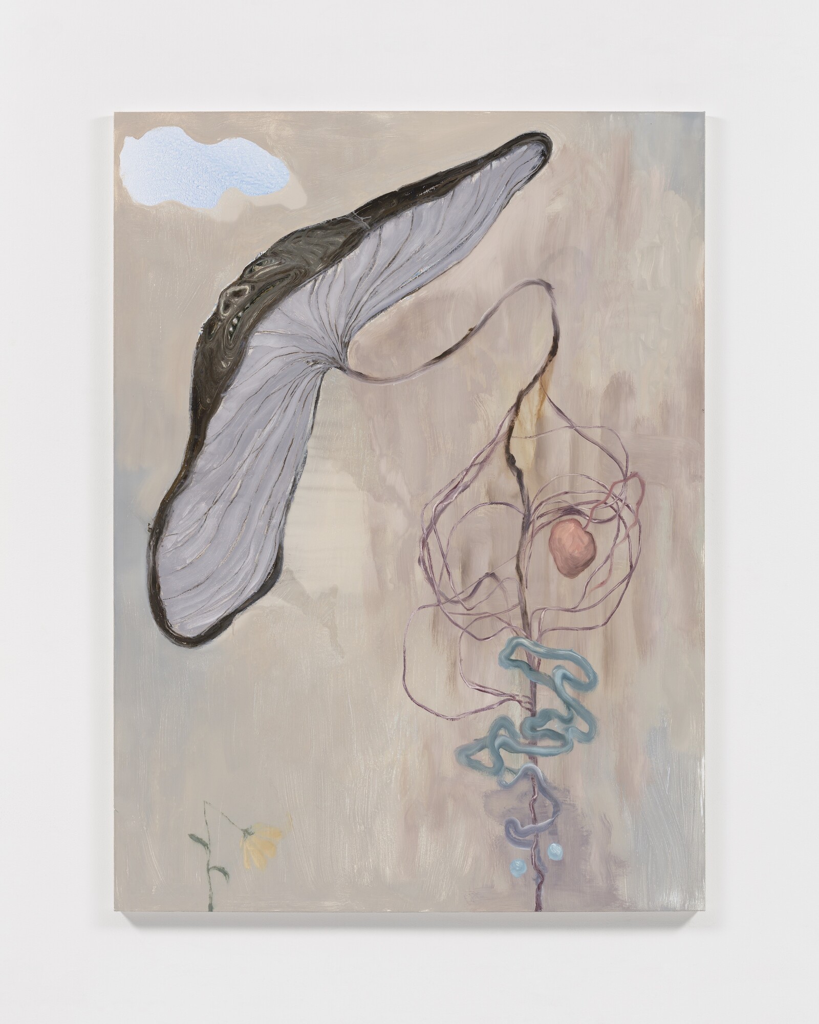 Each lone figure in Kantarovsky’s paintings expresses a different facet of pain. No Longer a Dog and I am a Body Shop (all Kantarovsky’s works are dated 2023) show figures who mirror traditional Butoh performers, turned away and covered in the Japanese white paint of mourning over their faces and limbs, ribs visible through their nearly translucent skin. In Bleeding Nature, the dancer suffers from the kind of wound that a Butoh dancer might feel in phantom form: an open gash over a bloody heart. Their bottom half disintegrates into ribbons, dangling from their fingertips and torso into a swirl of entrails that fertilizes a surrounding field of flowers and mushrooms. Secret Channels most closely anticipates the compositional tropes of portrait photography. Hunched over against a lilting floral backdrop, the elongated figure stretches their mouth into a pose. The fantastical Growth X discards the figure altogether, showing organs without a body instead of Deleuze and Guattari’s body without organs (BwO). An oversized mushroom cap, animated facial features only visible from a chin-up angle, floating above a delicate tangle of artery, intestine, and appendix threads.