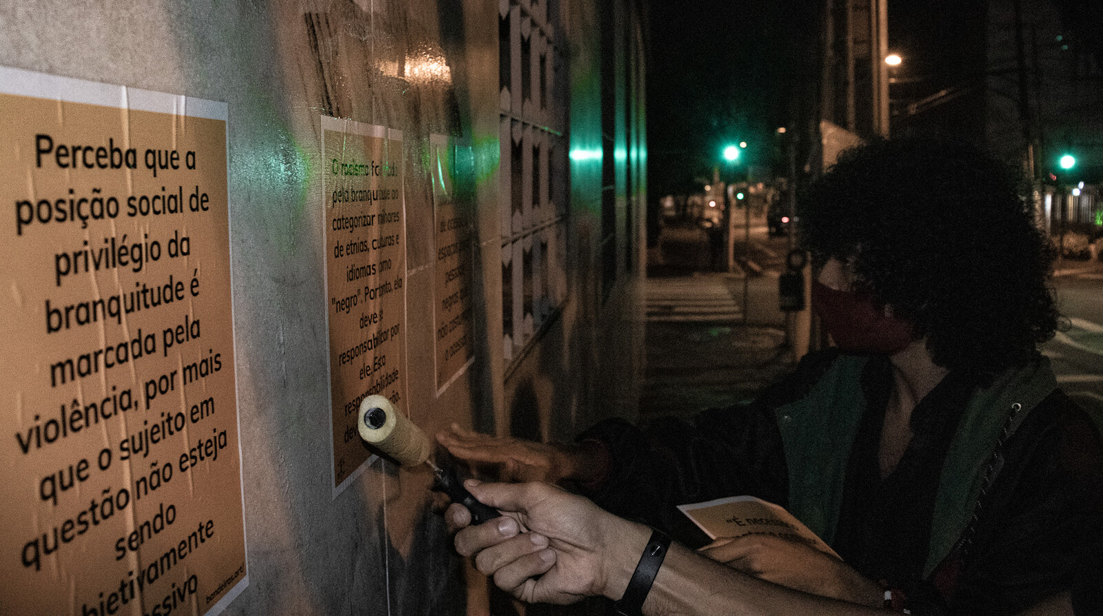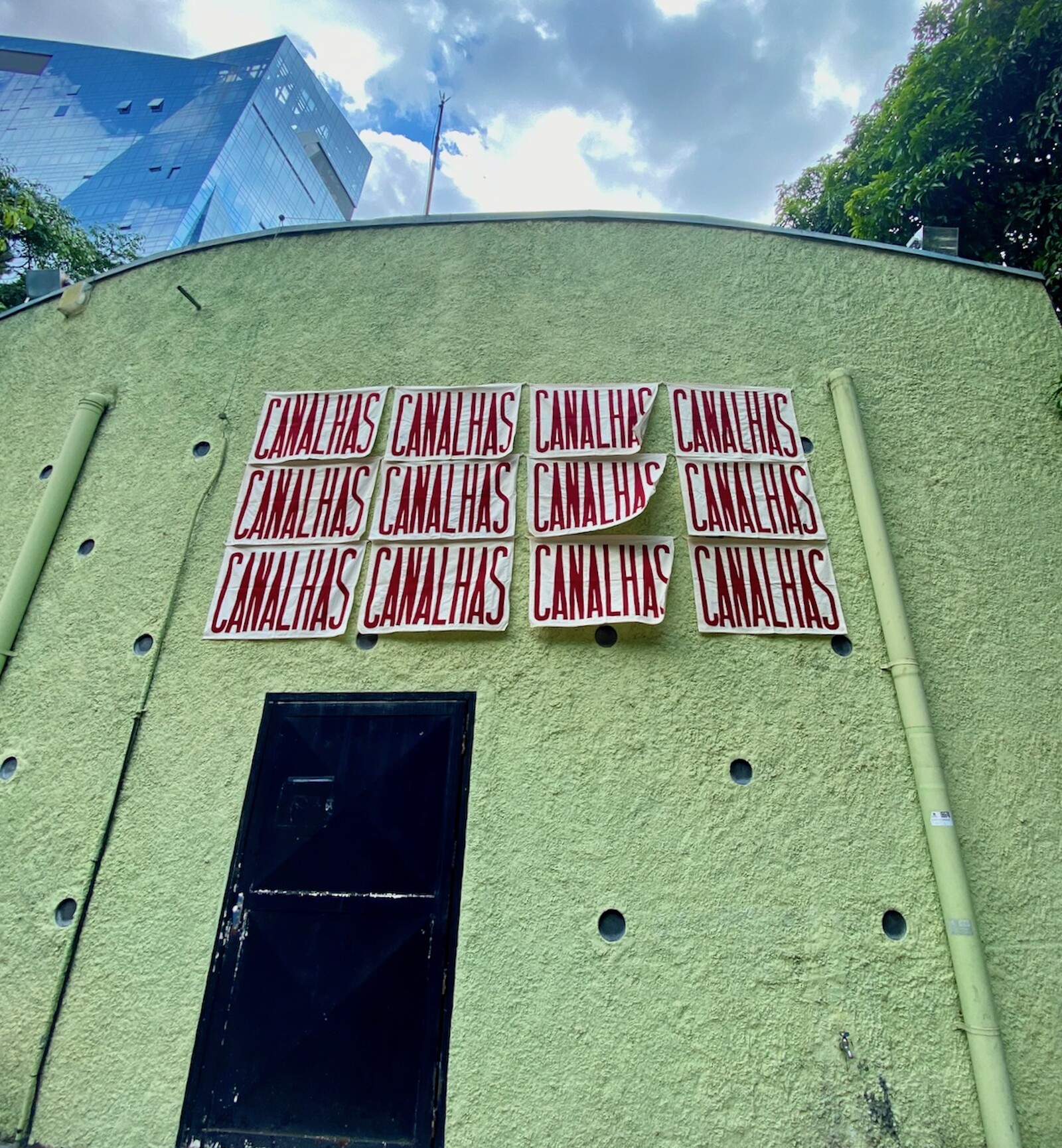 The shame that those who oppose Bolsonaro feel when the leader of their country uses such rhetoric is obvious in two works that utilize the Brazilian flag. In the center of the city I come across the familiar green, yellow, and blue national standard hung from a flexible metal pole bent back on itself to touch the pavement it is installed on, the flag trapped under the base to hold the tension of this street sculpture. O cinismo da certeza [The Cynicism of Certainty] (2021) by Felipe Cidade prods at the absolutism of far-right politics and its co-opting of national symbols. Likewise, a version of the flag on a wall at the Centro Cultural da Diversidade, stitched from scraps of sequined material by Tomie Savaget and titled Símbolo Nacional Pregado Com Fita Adesiva [National Symbol Nailed with Adhesive Tape] (2020), mournfully hangs from a single point, a fallen symbol. Many of the works in the show are didactic to the point of simplicity: from her “Classifieds” series (2014) Salvadoran artist Abigail Reyes flyposted the phrase, translated from the Portuguese, “I had the right to say no”; Alan Ariê put up 44 instructions for anti-racist actions (44 Práticas Antirracistas, 2021). More opaque are Aglomerado [Agglomerate] (2021) by Leka Mendes, a black flag containing a rough silver circle, a motif akin to a imploding star; and Kauê Garcia’s gloriously bizarre photo-printed banner featuring a closeup of self-styled Bond villain Elon Musk’s mouth (Nação (Elon Musk), 2021). Yet perhaps directness is necessary when working in the street.
