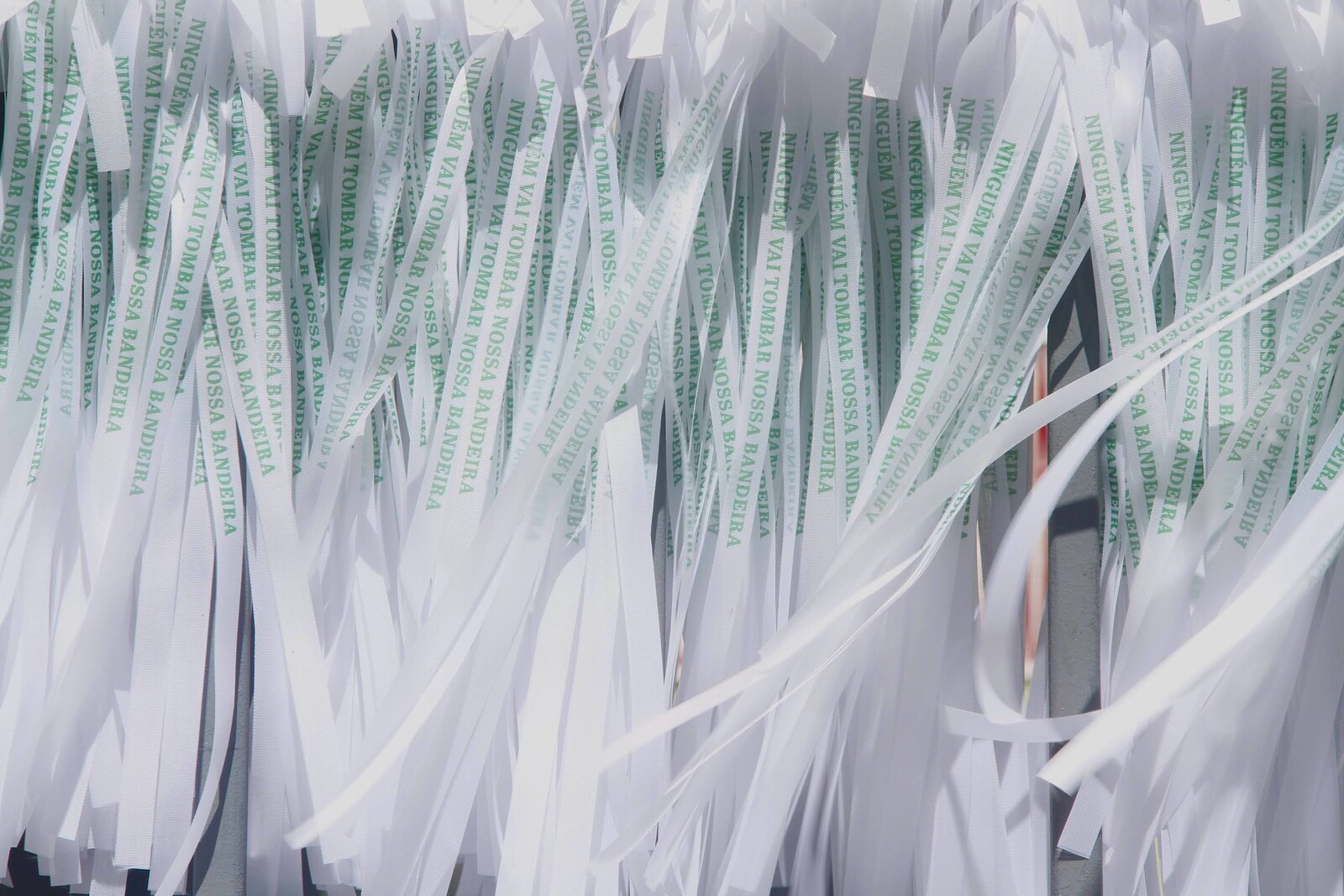 Julia Lima, a curator, recognized that what she would miss most was the simple pleasure of bodies coming together on the street. “It is the best of Brazilian culture,” she tells me in the Centro Cultural da Diversidade, an LGBT-orientated arts venue which plays host to the one indoor element of the show, “it’s a time when we are all on the streets, a communal moment.” Her response was to organize “Ninguém Vai Tombar Nossa Bandeira” [Nobody Will Drop Our Flag], an exhibition of flags, banners, and posters hung from buildings and pasted to street walls across the city. “The flag is inherently political,” Lima says. “And so is carnival.”
