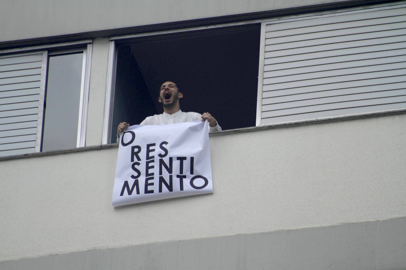 Strung across the windows of multiple apartments in my block are a series of banners. “Humiliating” reads one in Portuguese, the italicized word depicted in stitched red sequins. “Denier,” reads another. “Rotten.” Titled Pra quando o carnaval chegar [For when Carnival comes] (2021) they are the work of Nara Rosetto and flap in the wind, leaving little doubt as to whom the protest is aimed at. Jair Bolsonaro, Brazil’s far-right president, won’t be mourning the loss of carnival the way most in Brazil are: he was frequently the subject of criticism in the parades, and has done little to protect the country from the ravages of Covid-19. In 2019 he hit back by posting on Twitter a since-deleted video, taken at a bloco and featuring one reveler urinating on another, with the caption: “This is what many street carnival groups have become in Brazil.”