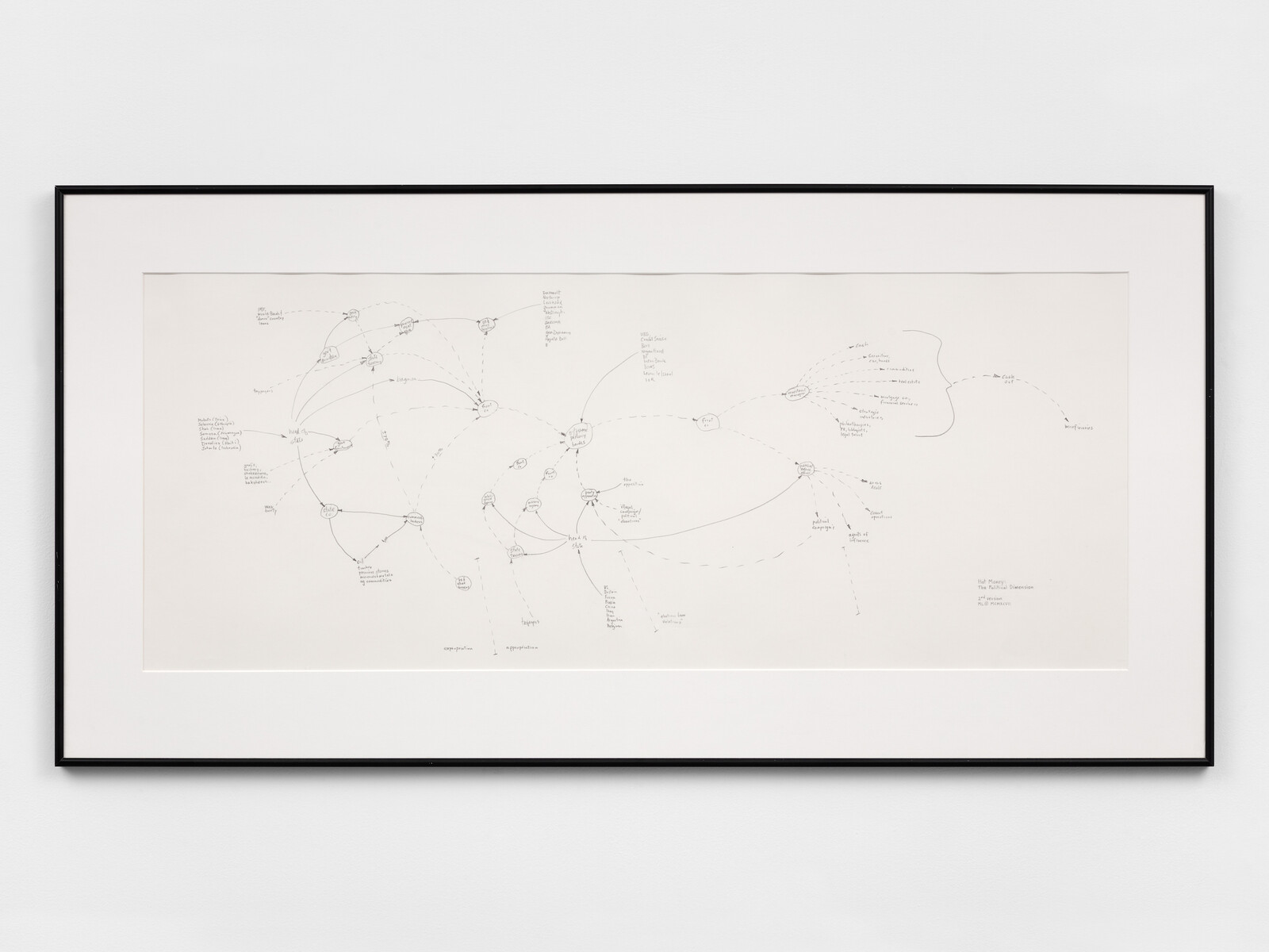 The show’s concise, well-written catalogue places the works in context without trafficking in much maligned, theory-laden International Art English. Raphael Rubinstein’s introduction functions as a self-aware meta-diagram of multifarious linkages among the works and concepts revealed in the exhibition. The nuanced connections established in the show undermine Eurocentric modernism’s narrative of rupture and progress. Joselit’s foundational essay is arguably more utopian than Raphael and Heather Bause Rubinstein’s curation. For Joselit: “The diagrammatic is characterized by a set of tactical evasions that are among Dada’s great contributions to modernism—the composition of works of art from vectors of force whose lines of flight escape objectivity altogether. In other words, diagrams assault commodity fetishes not by eroding their contours, but by demonstrating their semiotic and physical mobility, which, if intensified sufficiently, may cause the fetish to collapse altogether.”