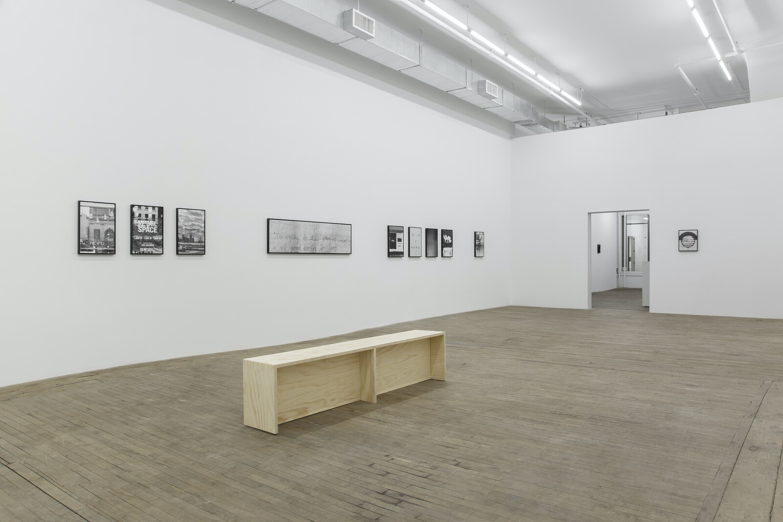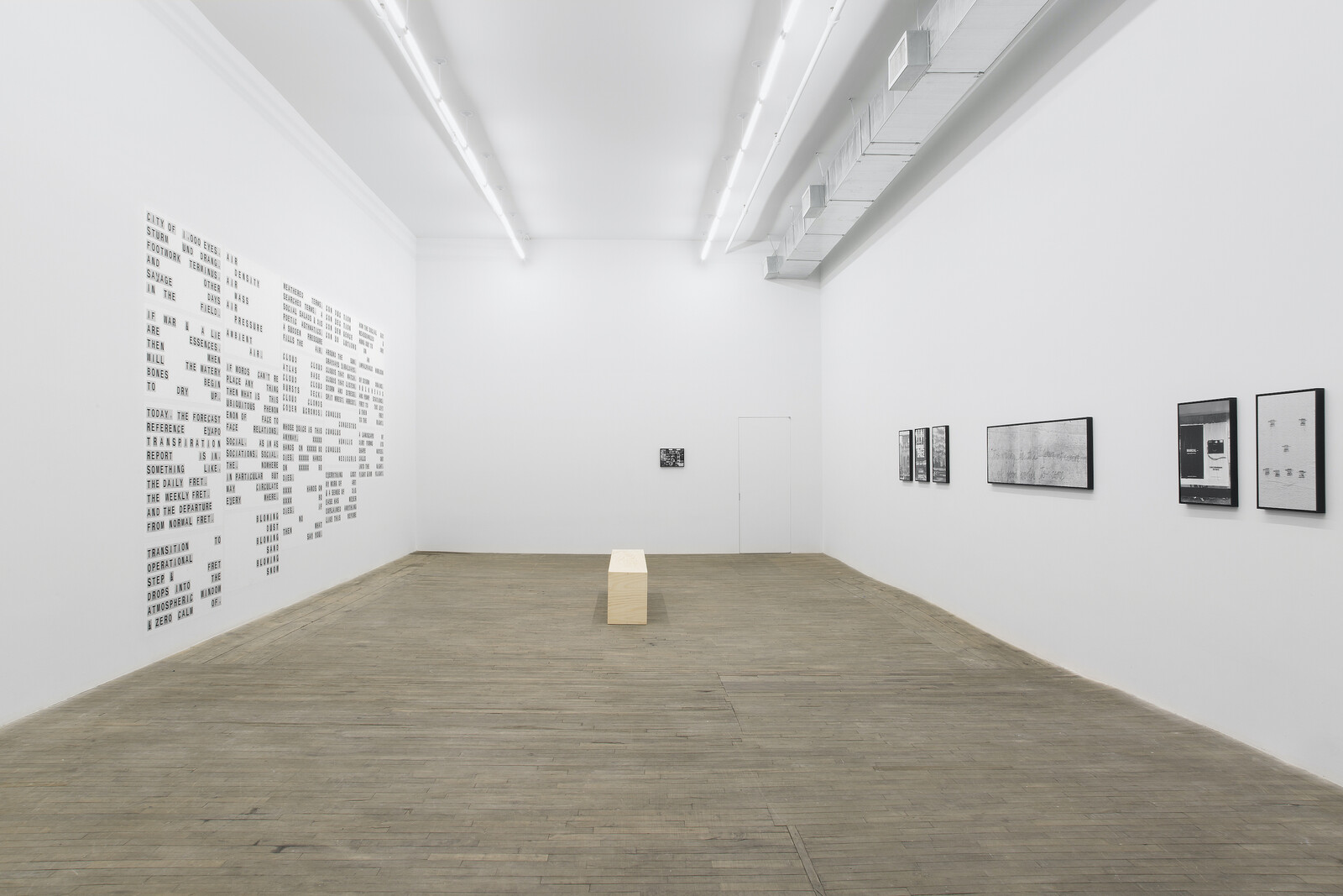 Shannon Ebner’s “FRET SCAPES” consists of thirteen black-and-white photographs arranged around a five-columned floor-to-ceiling poem called FRET, in which Ebner has some fun playing with the acronym in relation to the common verb as well as its technical use. The National Weather Service gives daily, weekly, and other reports that Ebner transcribes: “THE DAILY FRET/THE WEEKLY FRET/AND THE DEPARTURE/FROM NORMAL FRET.” It is a clever and concise commentary on a common relationship to news and weather forecasts and reports.