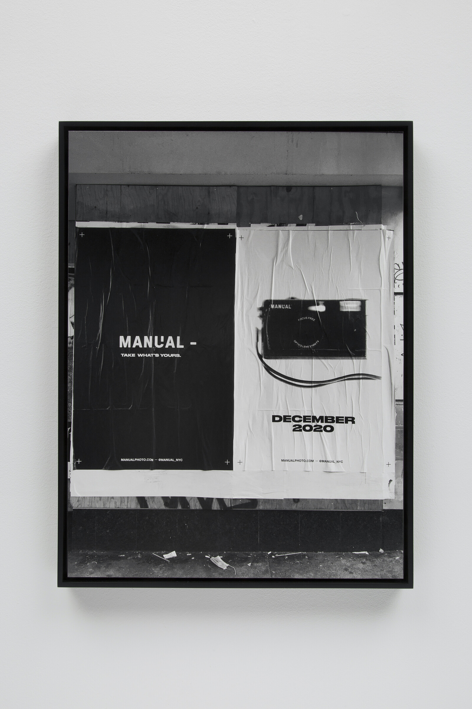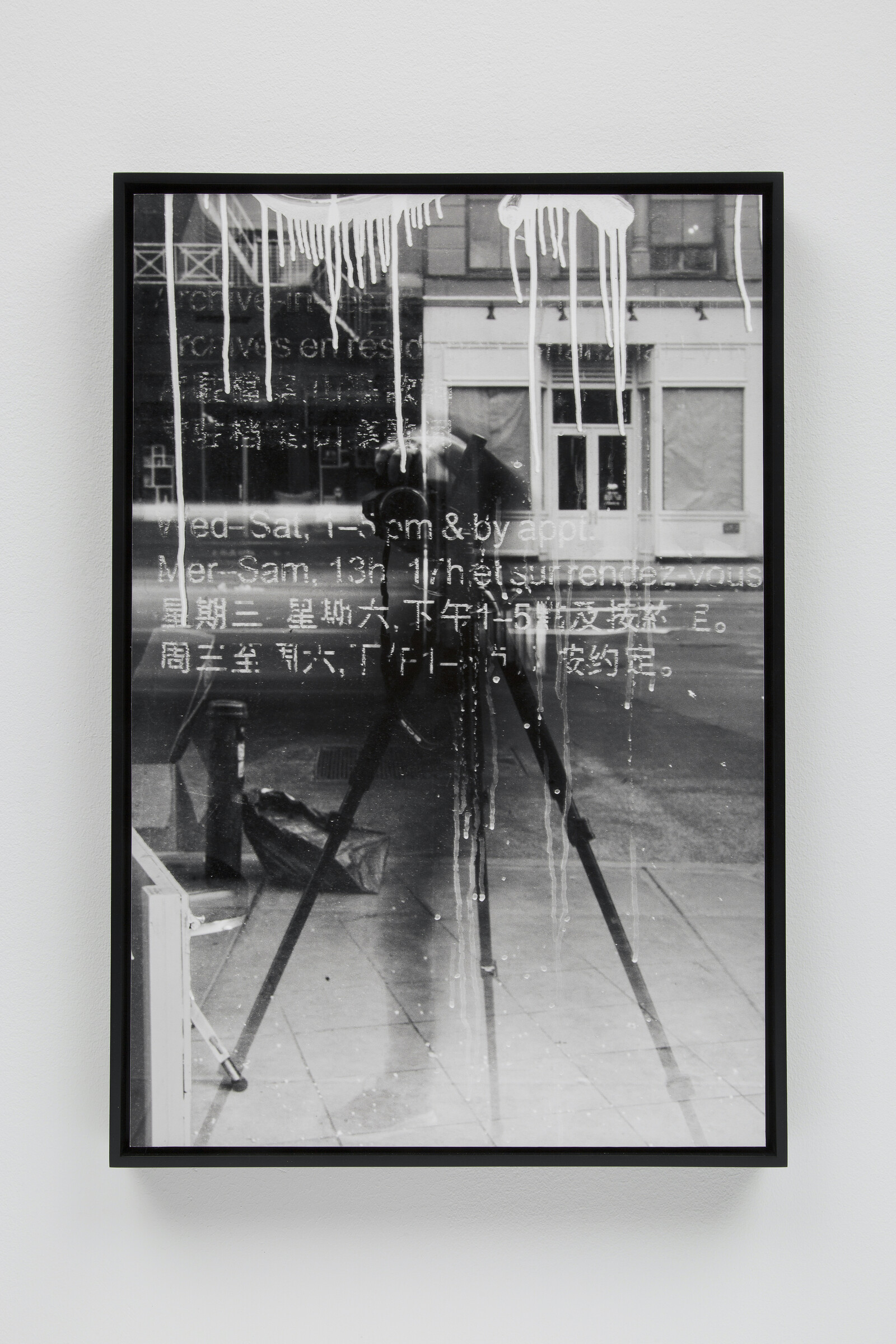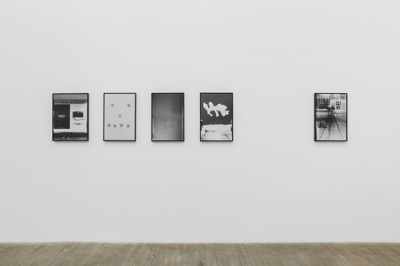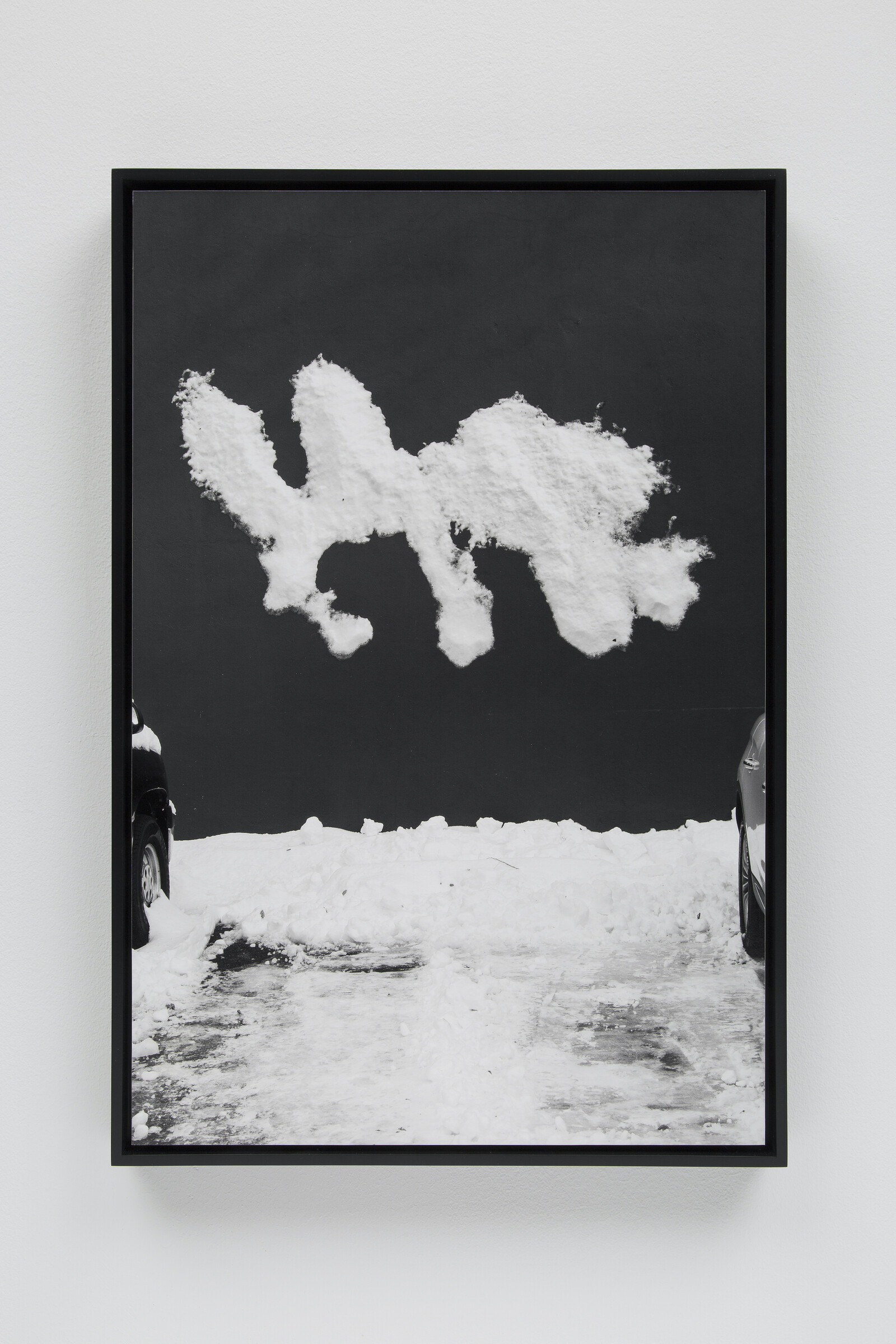 The poem isn’t the only text in the show. CIVIC TYPE FACE (2022) features barely legible text from a rubber stamp imprinted on a painted concrete surface in a sloppy but intentional-seeming pattern. NON IDEA SED IN REBUS (2021) records what might be offered as a toast written in wet concrete: “to waiting in the forever wet cement of good worlds to come.” Most of the other photographs contain text in the form of signage, price tags, and other indications of commerce, frequently layered onto each other or appearing in indecipherable layers due to reflections made weird and dense by their photographic capture. Other images—handprints like cave paintings, snow improbably stuck to a vertical surface like some hibernal iteration of the wet letters—gesture at text: the minor theme of language as object weaves through this anxious consideration of water and its imminent departure from earth. One of the older, but still operational, uses of the noun, “fret” is “ornamental interlaced work; a net; an ornament… consisting of jewels or flowers in a network.” The operative word here might be “tangled.” Within the frame of any one image, nothing so ordered as a network emerges, but the interlacing of images in reflective layers feels important here.