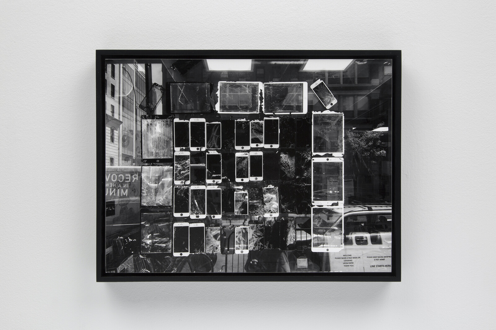 These references sap the show of meaning because they contradict, rather than complicating and enriching, what has clearly been recorded by Ebner’s camera: the detritus of a social world. What is on record here are commodities—objects concealing webs of social relations—that can be unpacked, demystified, and traced even if, in the case of the touchscreens, it is their dysfunction that is on display. The smartphones are worth fretting over for reasons that are neither mysterious nor specific to those particular smartphones in that particular window. I suspect that the storm drains in the poem may be a reference to another object-oriented ontologist, Jane Bennett, who would like us to believe that a purely descriptive, contemplative approach to urban infrastructure and dead rats yields more than a studious consideration of the human and industrial origins of waste, poison, and sea levels. This is simply untrue. It fails as both poetry and politics.