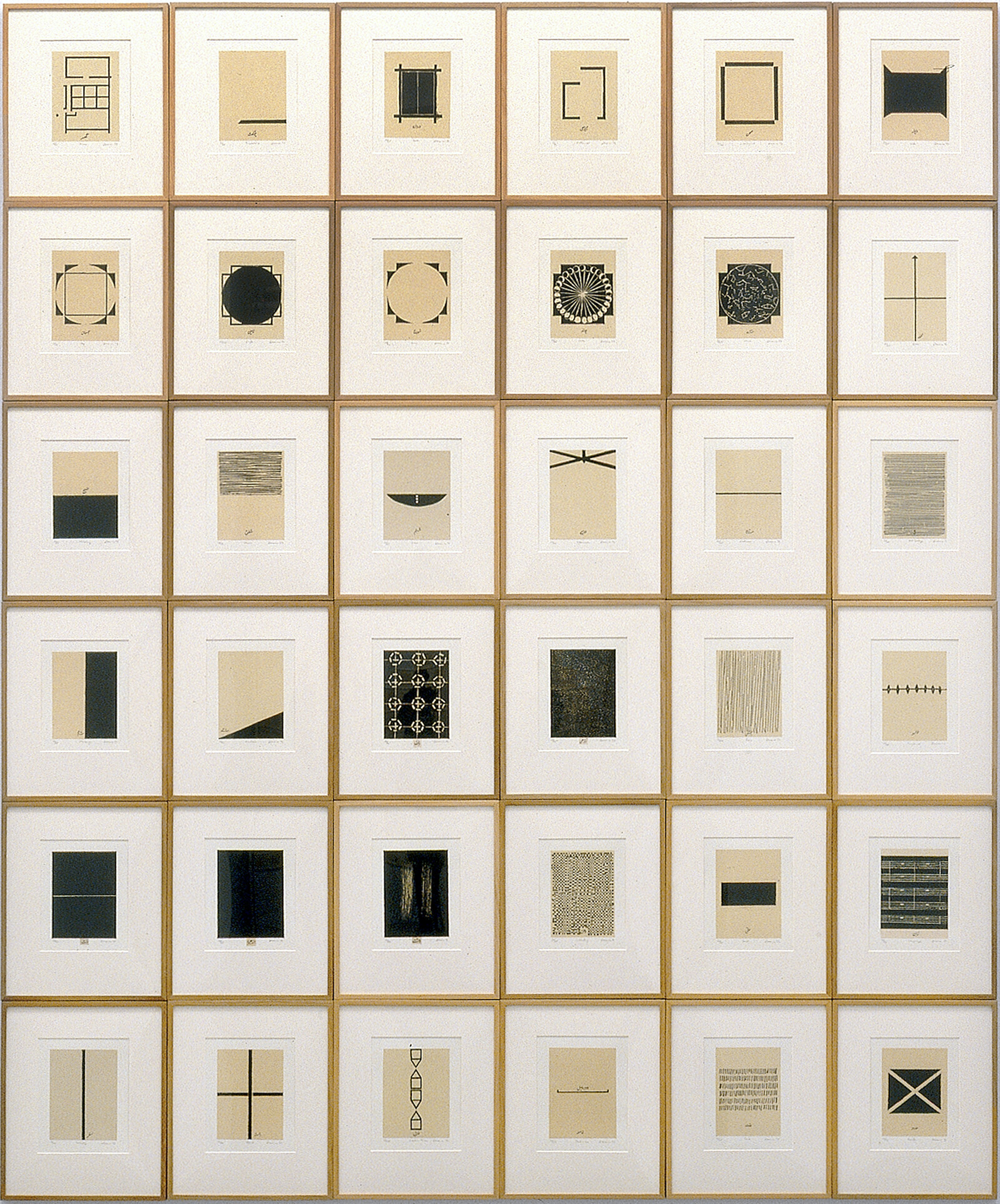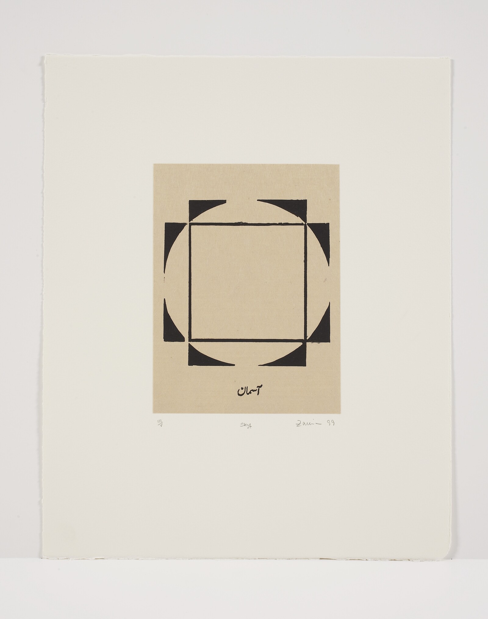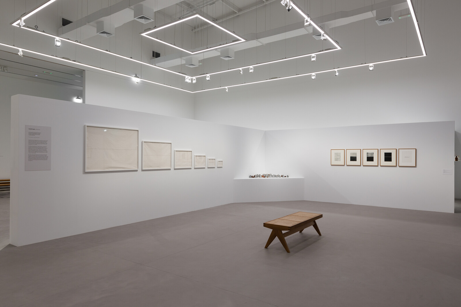 Zarina’s “Home is a Foreign Place” (1999) is a double inauguration. Comprising a series of 36 woodcuts, the work sets the conceptual tone for the show and lends one of its motifs (Aasman [Sky]) to the foundation’s logo: a delicate, geometric pattern of rectangles, squares, and circles in perfect symmetry. In each of the woodcuts, processes of abstraction and translation feed into textual, visual, and numerical markers of how the artist relates her own life to ideas of home and belonging. Faasla [Distance] shows a straight line with “7438 miles” written above it—the distance between Aligarh in India, where Zarina was born, and Manhattan, where she has lived since the 1970s. Similarly, Ghar [Home], the first panel in the series, shows the floorplan of Zarina’s childhood home—or how she remembers it. Each of these woodcuts evidence a subtle engagement with the shape and accumulation of time, stretched between geometric fabulations, technical details, and selective memories of past experiences. Ghar also provides the schematic blueprint for the exhibition’s layout of temporary walls, suggesting that Gupta’s works are “housed” within Zarina’s—a nod to how different generations understand, imagine, and enact notions of home.