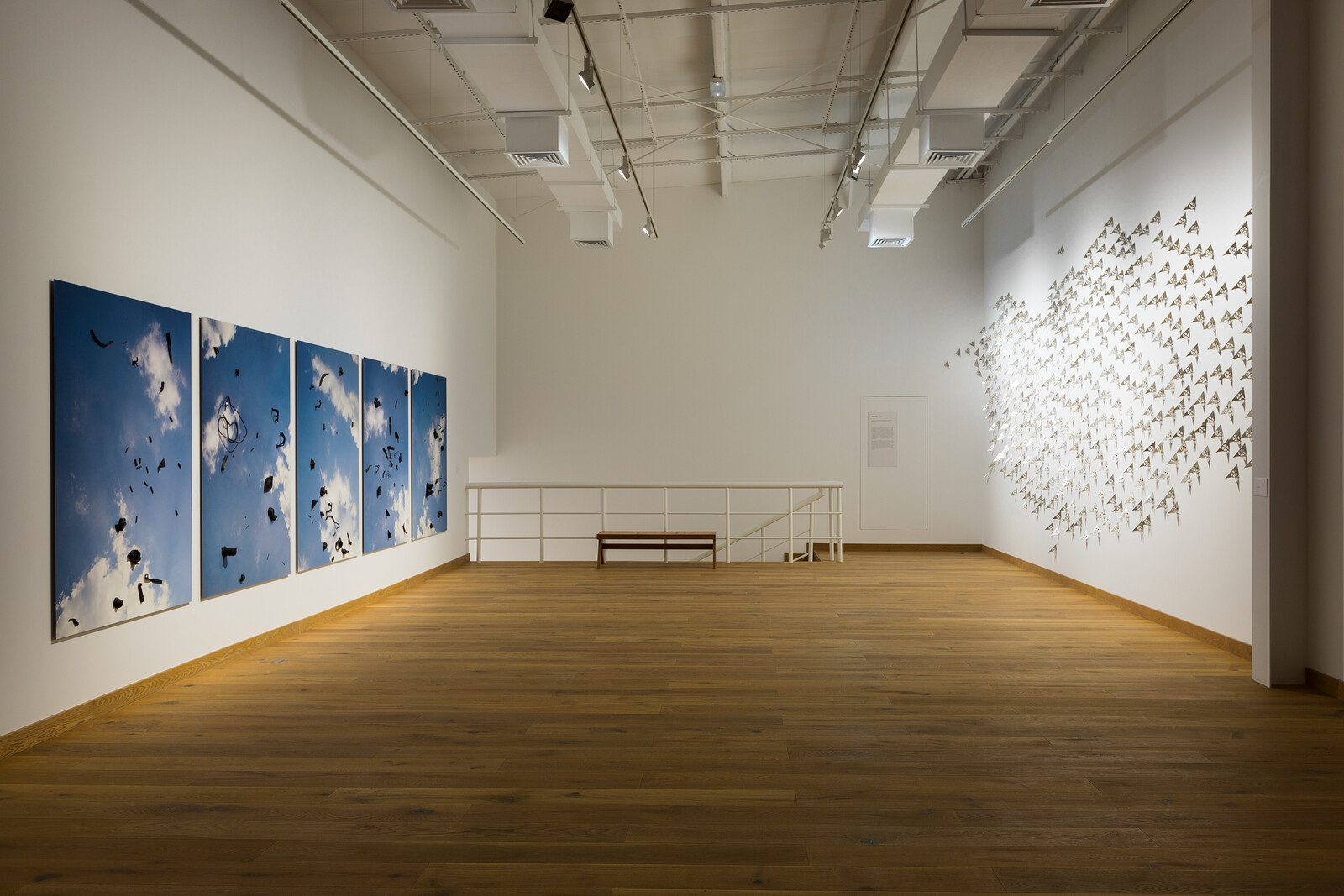Collective memory is further addressed in Gupta’s Altered Inheritances – 100 (Last Name) Stories (2014), an installation comprising a series of framed photographs spliced in half, shuffled, and then reinstalled along the line of split, which runs continuously around the room. This set of images is syncopated and wildly associative, ranging from historical photographs to snapshots and scans of abstract drawings. Short texts accompanying the images tell of people who abandoned their last names after migrating to a new place. The abstract geometry of the line again acts as both a divider and a connector, framing a particular kind of alienation as a condition of possibility for identification and belonging.