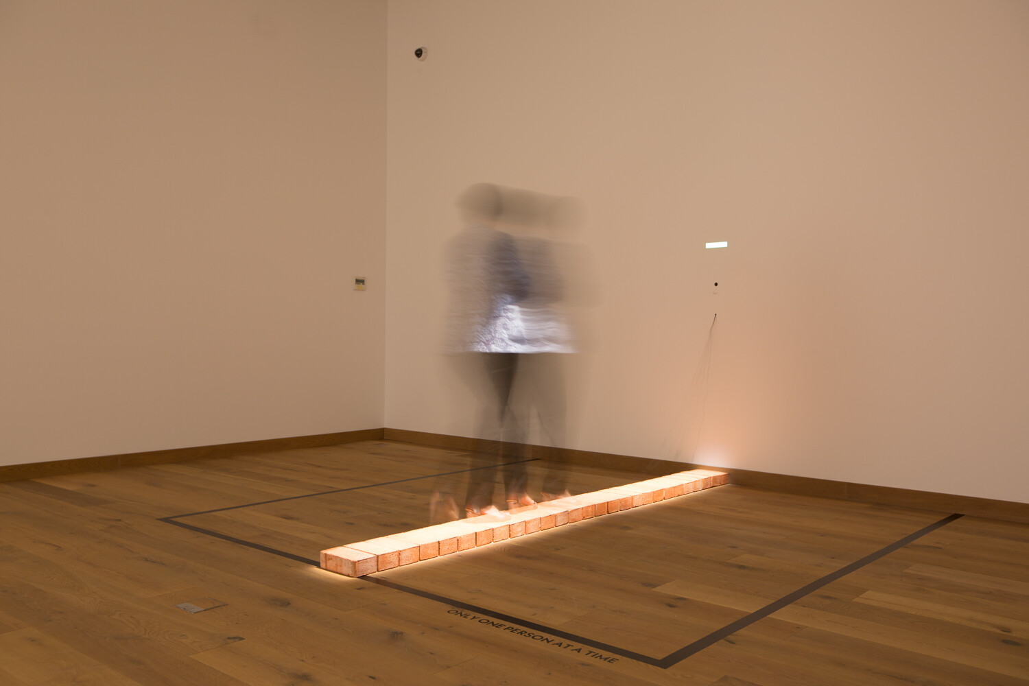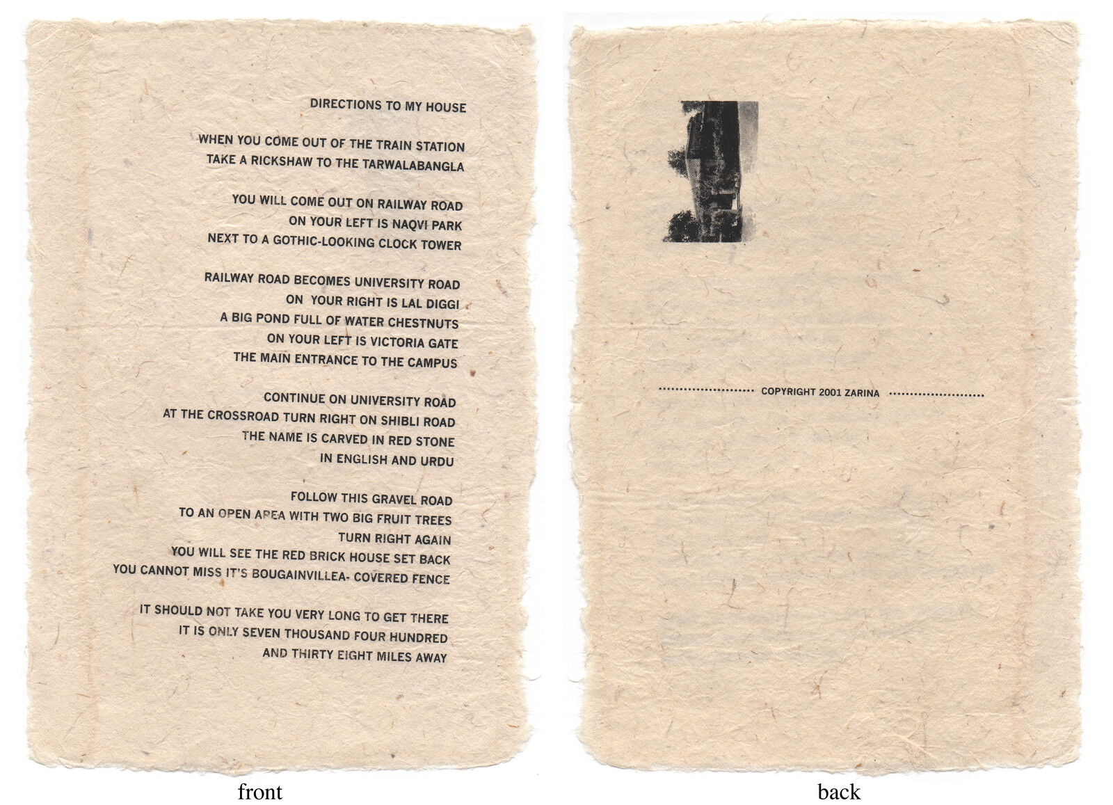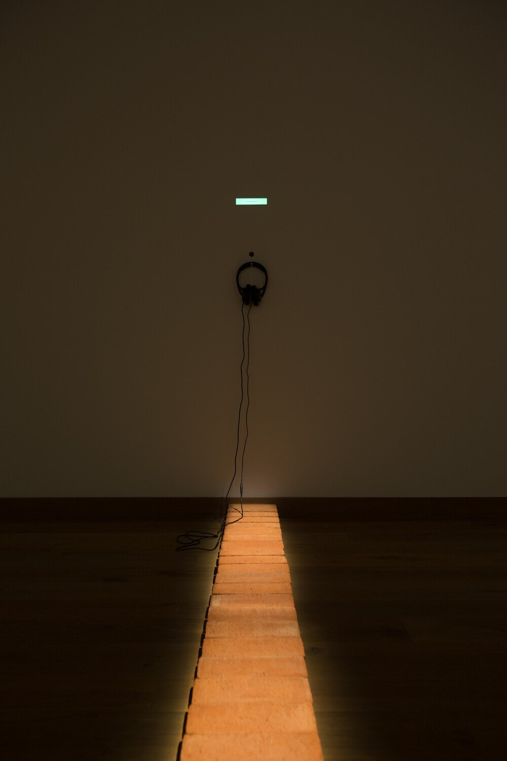 Such a nuanced approach corresponds with the exhibition design, which invites the audience to pay attention to how the terms of distance and intimacy are laid out across the space. Gupta’s Speaking Wall (2009–10), the final work in the exhibition, comprises a narrow brick walkway that leads to a wall on which a small LCD screen and a set of headphones are mounted. The wall speaks of itself, of home and the outdoors, variously instructing viewers to move closer to and further away from the wall. The dimly lit, wobbly, and dramatic scenography of Speaking Wall renders ideas of division and closeness material and affective. Throughout this exhibition, the pairing of Gupta and Zarina weaves an evocative yet abstract narrative of how division and displacement are closely bound up with the terms of spatiotemporal belonging. Fitting the occasion of an intergenerational dialogue, “Altered Inheritances” traces lines of movement that cross paths and might reconvene again, always back home but never in the same place.