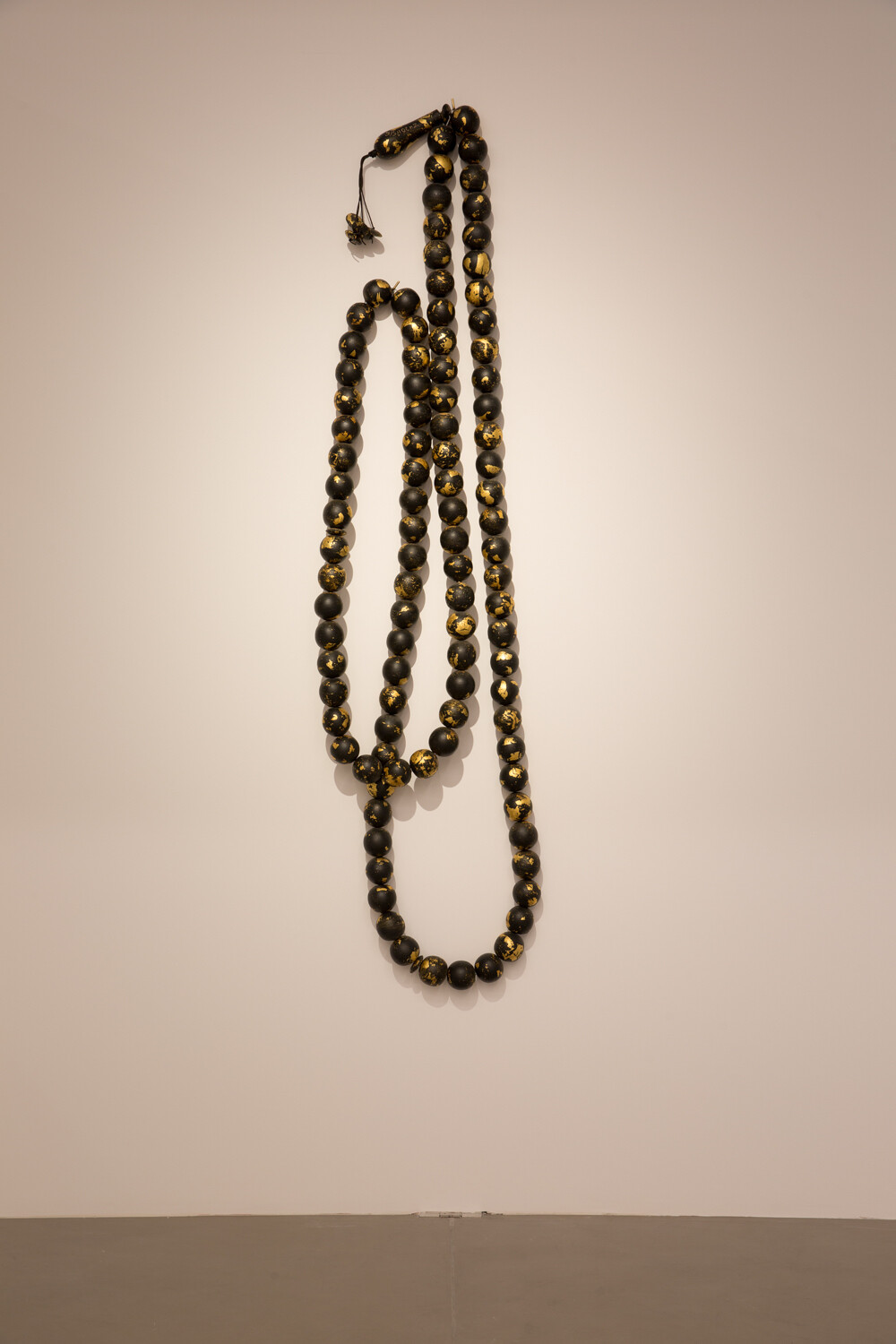Hanging from a nearby wall, Zarina’s oversized Tasbih [Prayer Beads] (2011) embody ritual or spiritual temporalities as well as calibrated, weighty units of measured and discretized time. In Gupta’s Untitled (2014), displayed near it, watch hands set against a background of black felt resemble stars afloat in a dark sky: an abstract treatment of a technical device that addresses duration and distance. Connecting the artists’ works are the interrelated dynamics of belonging, time, and the experience of moving across scales—the terrestrial and the cosmic, the personal and political, the technical and the instinctive.