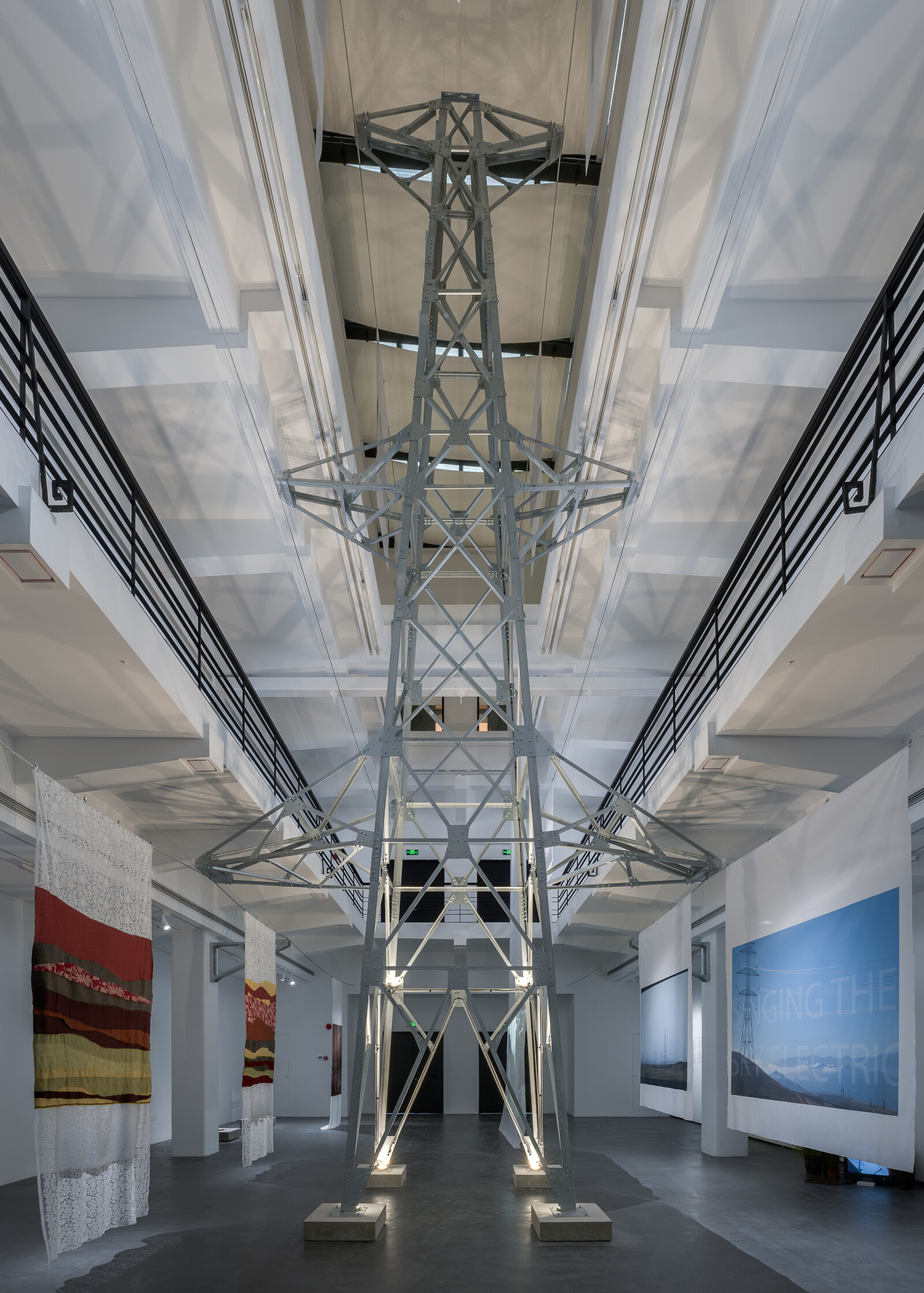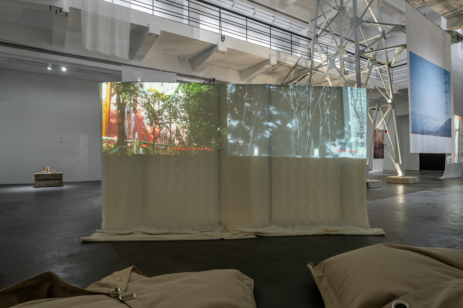 If the relationship between power and extraction in These Petrified Paths seemed at first to be primarily iconographic—signaled by the huge Of that colossal wreck looming over Rao’s new and past works—the project gradually reveals linguistic and material traces of power’s elusive influence. Hanging from various heights in the central atrium, the three-story gallery also features Watermarks (2023). Its long pieces of fabric are entirely white apart from areas with projections or still images that feature motifs of pylons and cryptic, dimly legible slogans about electricity and extraction. “Singing the sky electric;” “This circuitree sings / of oil and death.” Here, power has even absorbed recognizable quotations (Whitman’s “I sing the body electric”), muddying existing texts with its own imperatives.