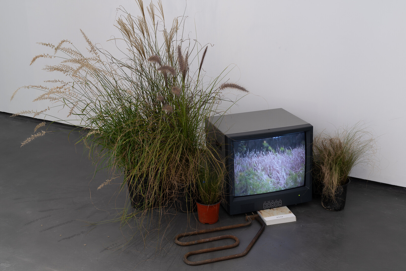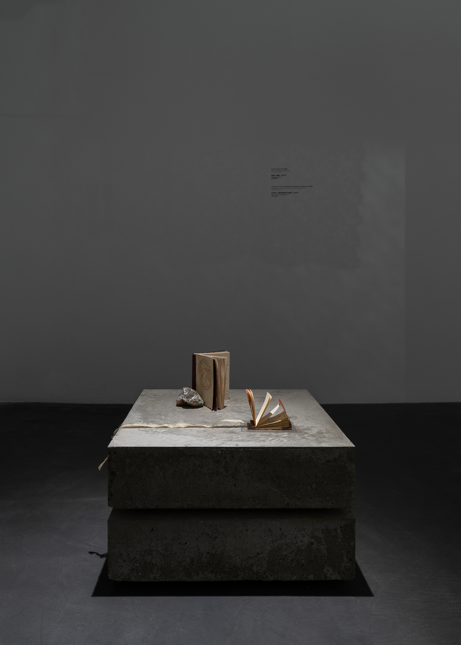 One new work, Landfill (2023), features books and found objects placed on low pedestals, at a height that frustrates reading. Styled neatly but reduced to a kind of tomb-like appearance along the outer edge of the gallery, one has to squat to see small sketches in the handmade books. They are flanked by geological matter that has an air of recovered flotsam, including what seem like one-piece residues of larger machines, which have a maritime feel. Landfill includes the only whole, tangible books in the show, but they remain sculptural, their texts unreadable.