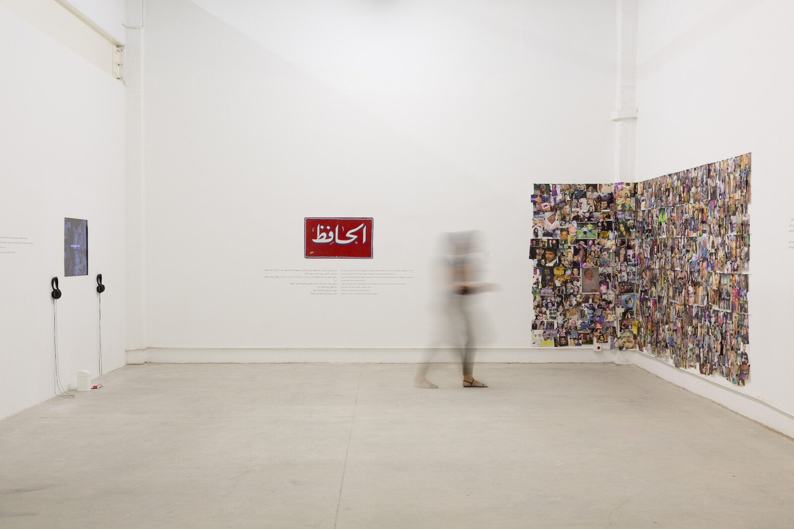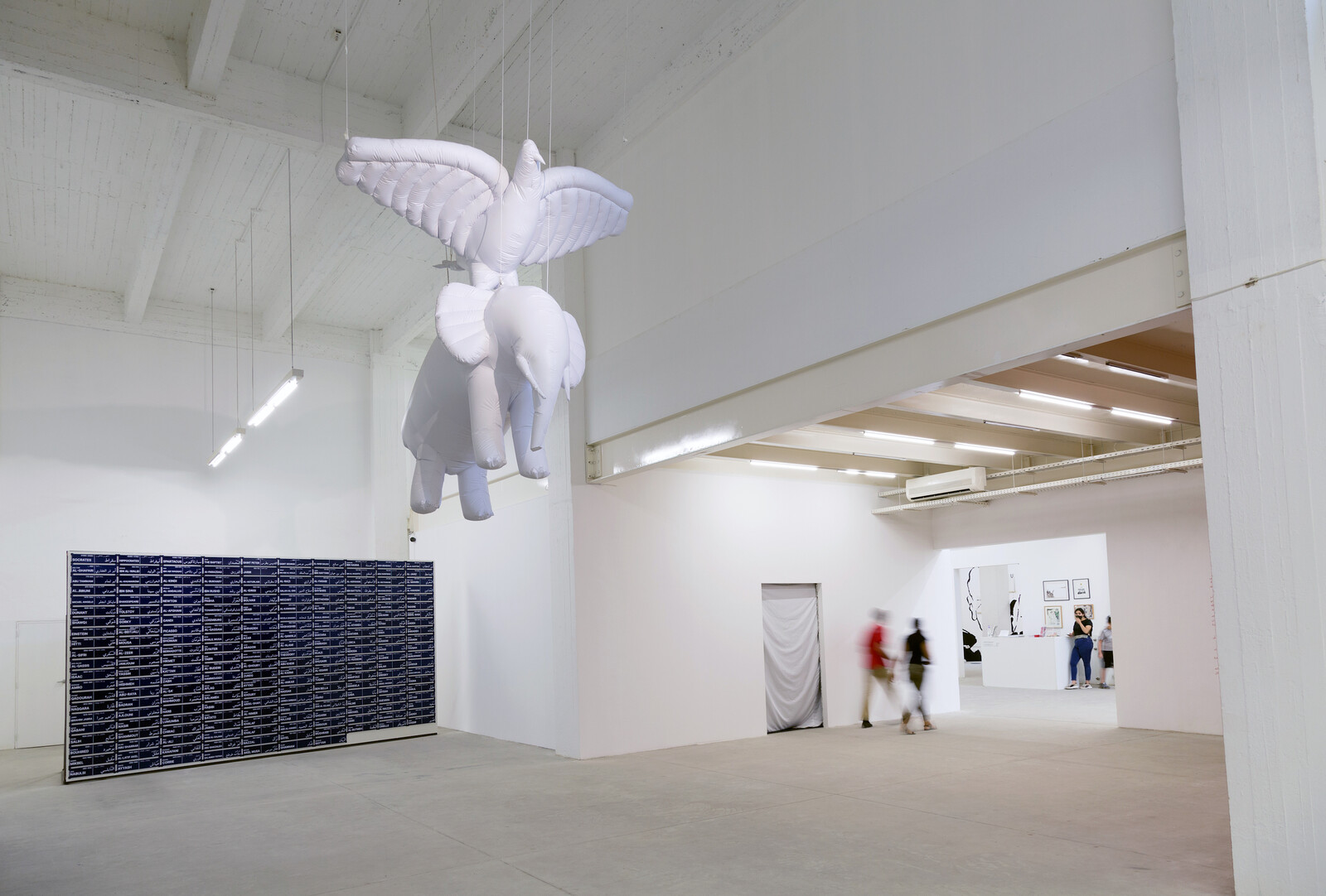 The wall text in the gallery’s main room is given as much space as two of the three works displayed in it: The Keeper (2010–14), an installation comprising a vast archive of photographs which the Ramallah-based artist sourced from a street vendor named Mustafa, and All The Names (2011/21), an installation of 207 steel street signs named after individuals with links to the city. The posters, street names, and wall text are overlooked by a third work: The Elephant and the Dove (2021), comprising two white, inflatable versions of the eponymous animals suspended one atop the other from the ceiling.