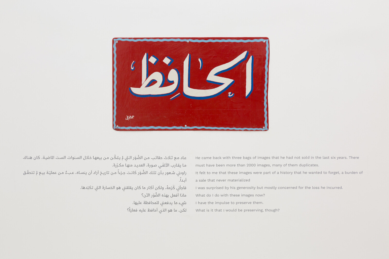 How can one write about Shuruq Harb’s work when the work itself is already a wonderful text about the potential of writing? At first glance, one could be fooled into thinking that the artist’s questioning of a dominant visual culture tackles its subject straightforwardly, through images, only to be surprised at how essential writing, text, and language are to the work. Not that they were ever separate to begin with.