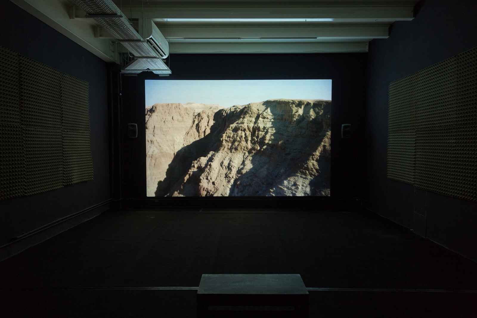 The artist’s work and world provoke a desire for the edge, for the abyss; not only in the manner of an adolescent thrill, but in questioning a liberal definition of freedom based on rights and centered on the individual. In her newest video The Jump (2021), which like her 2018 video The White Elephant is displayed in its own darkened room adjacent to the main exhibition space, Harb confronts us with a suicide, a freefall into the void. The work begins with a geological definition of depression: it is set in the “lowest point on earth,” the Jordan Valley. A computer-generated voice asks “if we jump from here, how high can we jump?” and wonders whether “it will be a happy accident or a detrimental crash.”