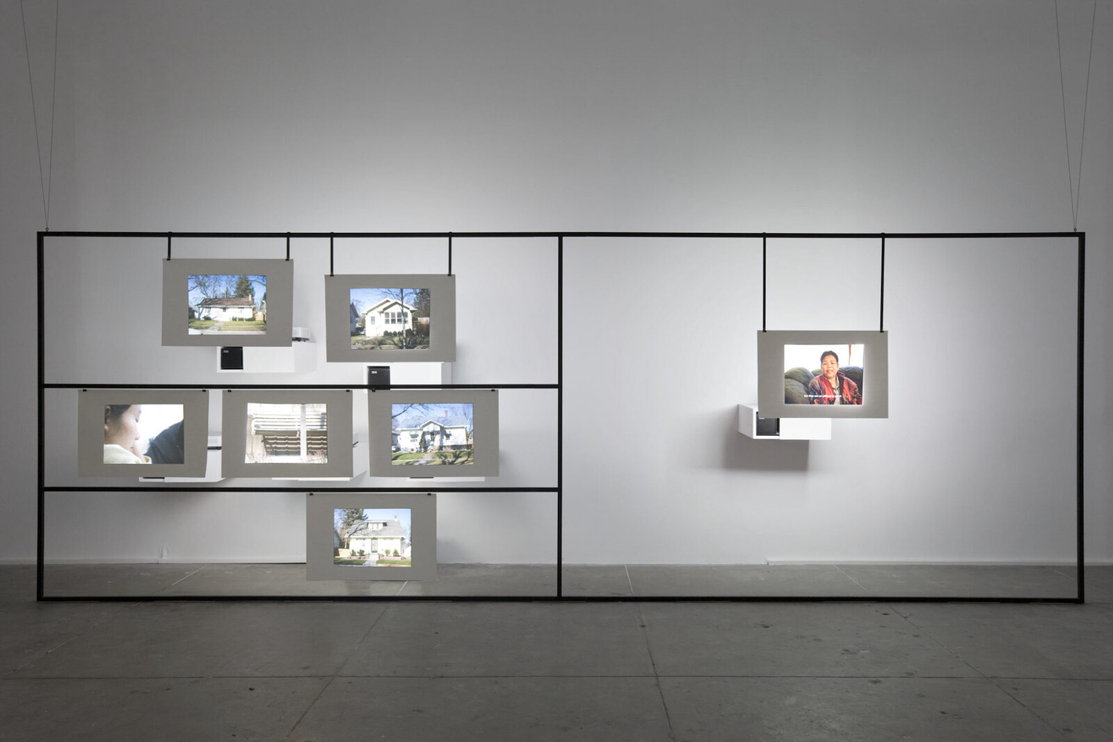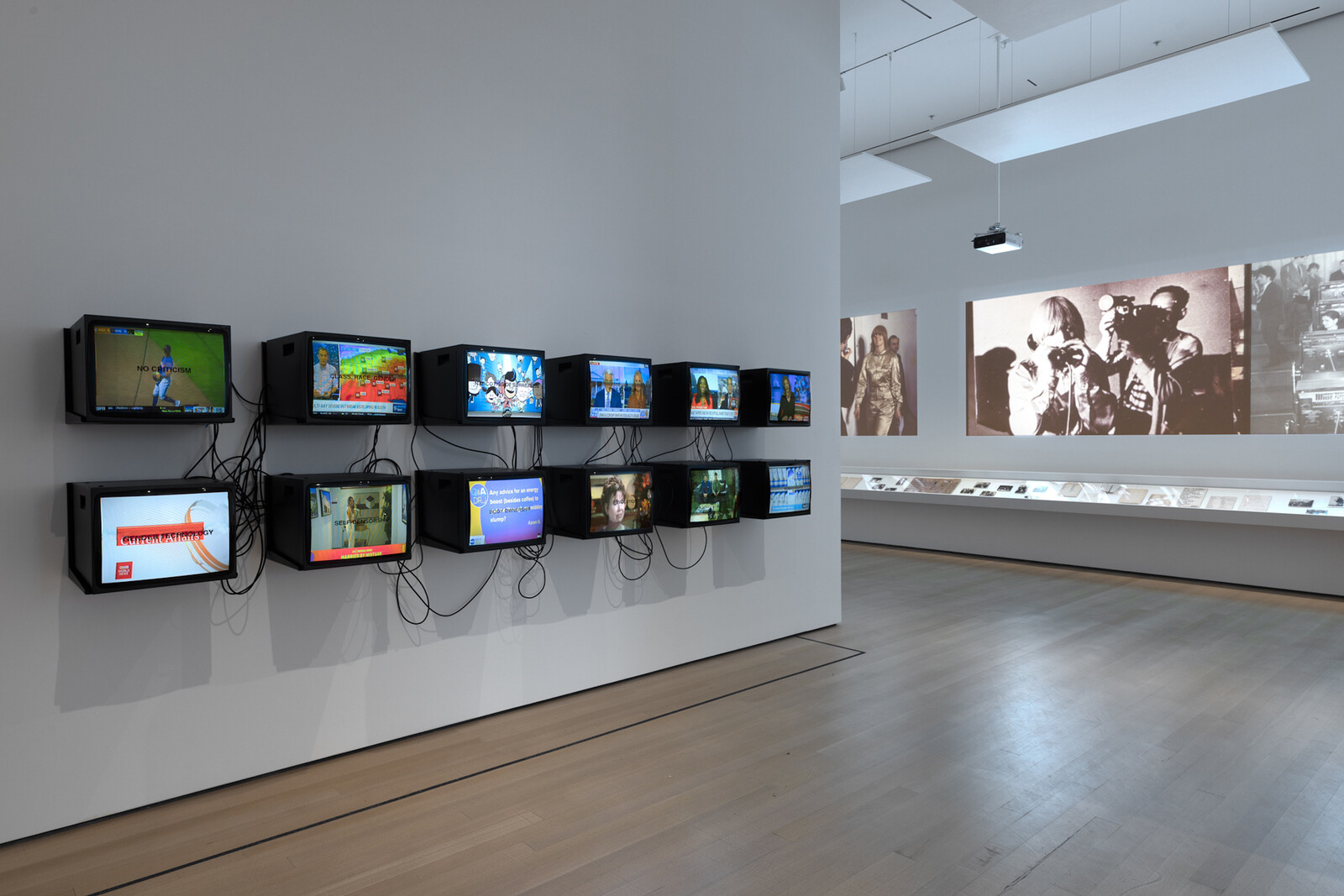 In individual works—and in the show as a whole—the condition of inundation is both subject and strategy. The problem of our shattered attention spans, for which many would blame the proliferation of video screens, is not unrelated to the problem of exhibiting moving images in gallery settings. “Signals” confronts the viewer with no less than thirty-five hours of material. Certainly, a good number of these works do not ask to be experienced in full or from beginning to end. Temporal linearity is thwarted in the circular polyphony of Nil Yalter’s Tower of Babel (Immigrants) (1974–77/2016), and in the enveloping planetarium-like attraction that is Stan VanDerBeek’s reconstructed Movie-Drome (1964–65) (which actually deploys 16mm projection; the video aspect stems from the work’s unrealized potential as one node in a global “culture intercom”). But many single-channel pieces that require sustained engagement are presented as part of looped programs. Nearly forty videos—including important work by Ant Farm, Howardena Pindell, and Walid Raad, and lesser-seen standouts like Michael Klier’s Der Riese (The Giant) (1983), an eerie city symphony assembled from surveillance footage, and Yau Ching’s layered portrait of exile and dislocation, Flow (1993)—reside within the nine monitors that make up a viewing nook beyond the last gallery. Over two lengthy visits to the show, I could not help noticing that most museumgoers did not linger here for more than a few minutes, if at all. Anticipating the limits of spectatorial attention, MoMA has made many of these videos available for online streaming—a logical and meaningful decision that increases the reach of these works even as it effectively consigns them to a context of even greater overload and inattention.