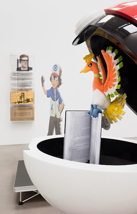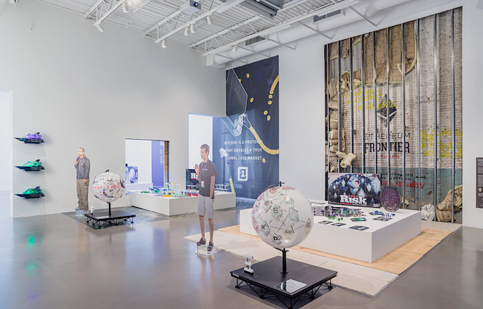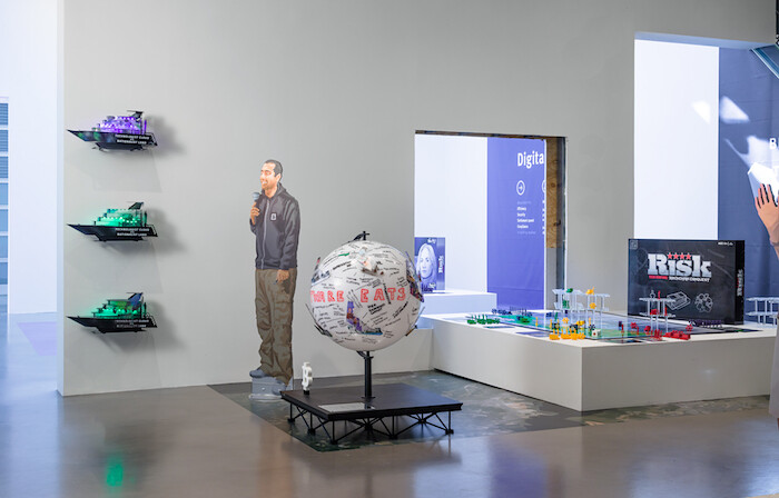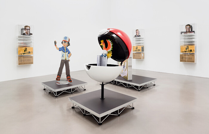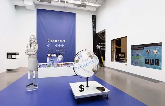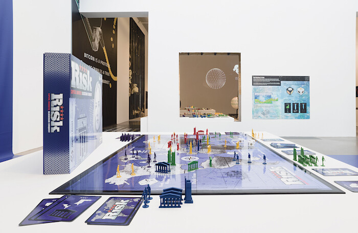 These questions were in full effect at Denny’s recent exhibition at Chelsea’s Petzel Gallery, which bore the vaguely accelerationist title “Blockchain Future States” and was based around work shown last summer at the Berlin Biennale. The show styled itself as a sort of introductory overview of blockchain technology—a mode of storing encrypted data across distributed locations, which forms the basis for the open-source digital currency Bitcoin. Denny’s timing was perfect, in that the extensive commercial and political implications of blockchain are just beginning to become broadly recognized, even as they have been obvious to tech insiders for some years now. It is clearly the moment to reckon with the potential impact of globally available encryption, whether in social, economic, or geopolitical terms, and to begin thinking through the ways that these changes will play out on the aesthetic level. In a rather transparently didactic gesture—whether earnest or ironic was, not surprisingly, somewhat tough to judge—the show functioned as a kind of primer, with one gallery devoted to the history and founders of Bitcoin, and the others to three of the most prominent blockchain ventures (Digital Asset Holdings, 21, and Ethereum). The basic premise, which likely struck some as clever and others as cutesy or patronizing, was children’s games: Pokémon for the Bitcoin sculptures, and Risk for the blockchain installations, which incorporated vinyl banners, larger-than-life, custom-made board game pieces, an infomercial-ish video projection, and wall cuts à la Michael Asher.